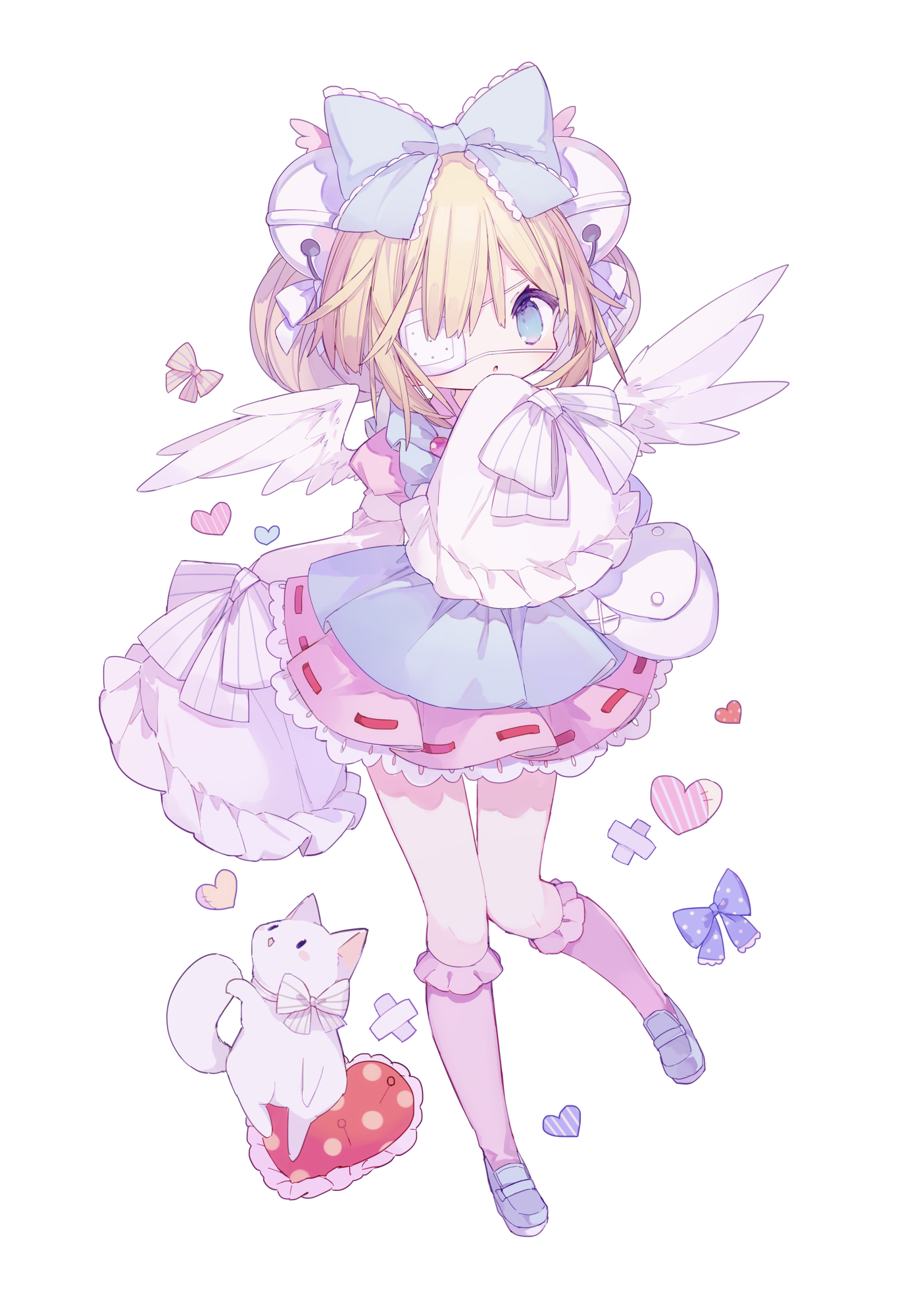 1girl animal bell blonde_hair blue_bow blue_eyes blue_shoes bow cat commentary_request commission eyepatch frilled_skirt frills full_body hair_bell hair_bow hair_ornament highres kneehighs long_sleeves looking_at_viewer medical_eyepatch miniskirt mizumizu_(phoenix) open_mouth original pink_skirt pink_socks pixiv_commission pleated_skirt polka_dot polka_dot_bow ribbon-trimmed_skirt ribbon_trim shirt shoes short_hair simple_background skirt sleeve_bow sleeves_past_fingers sleeves_past_wrists socks solo standing standing_on_one_leg striped_bow white_background white_bow white_shirt