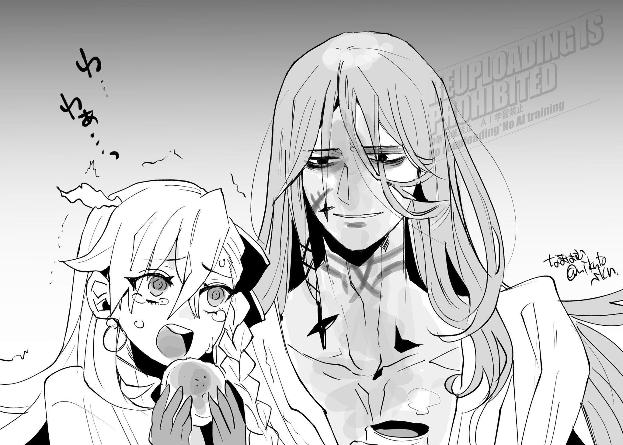 ahoge azrael_(grand_assassin)_(fate) bow braid collarbone commentary_request dark-skinned_male dark_skin earrings fate/grand_order fate_(series) food gloves hair_bow highres holding holding_food jewelry long_hair nikutoskn olga_marie_animusphere olga_marie_animusphere_(unbeast) open_clothes open_mouth open_shirt scar scar_on_face smile tearing_up twitching_ahoge very_long_hair