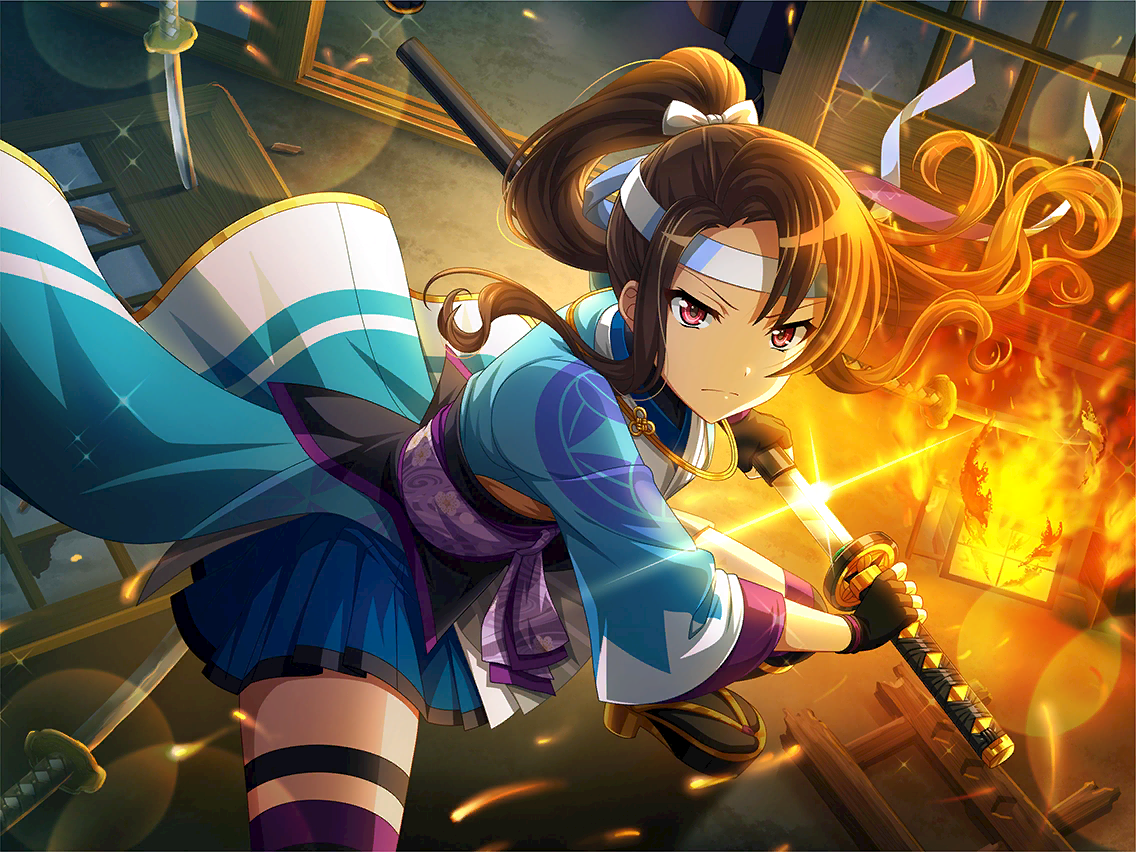 1girl akikaze_rui black_gloves black_hair blue_hakama blue_kimono broken closed_mouth cosplay fighting_stance fingerless_gloves fire frown game_cg gloves hakama headband holding holding_sheath holding_sword holding_weapon japanese_clothes katana kimono long_hair long_sleeves looking_at_viewer obi official_art parted_bangs planted planted_sword planted_weapon ponytail purple_thighhighs red_eyes saitou_hajime saitou_hajime_(cosplay) sandals sash sheath shinsengumi shoujo_kageki_revue_starlight shoujo_kageki_revue_starlight_-re_live- sidelocks solo sword thigh_strap thighhighs unsheathing upper_body v-shaped_eyebrows weapon white_headband