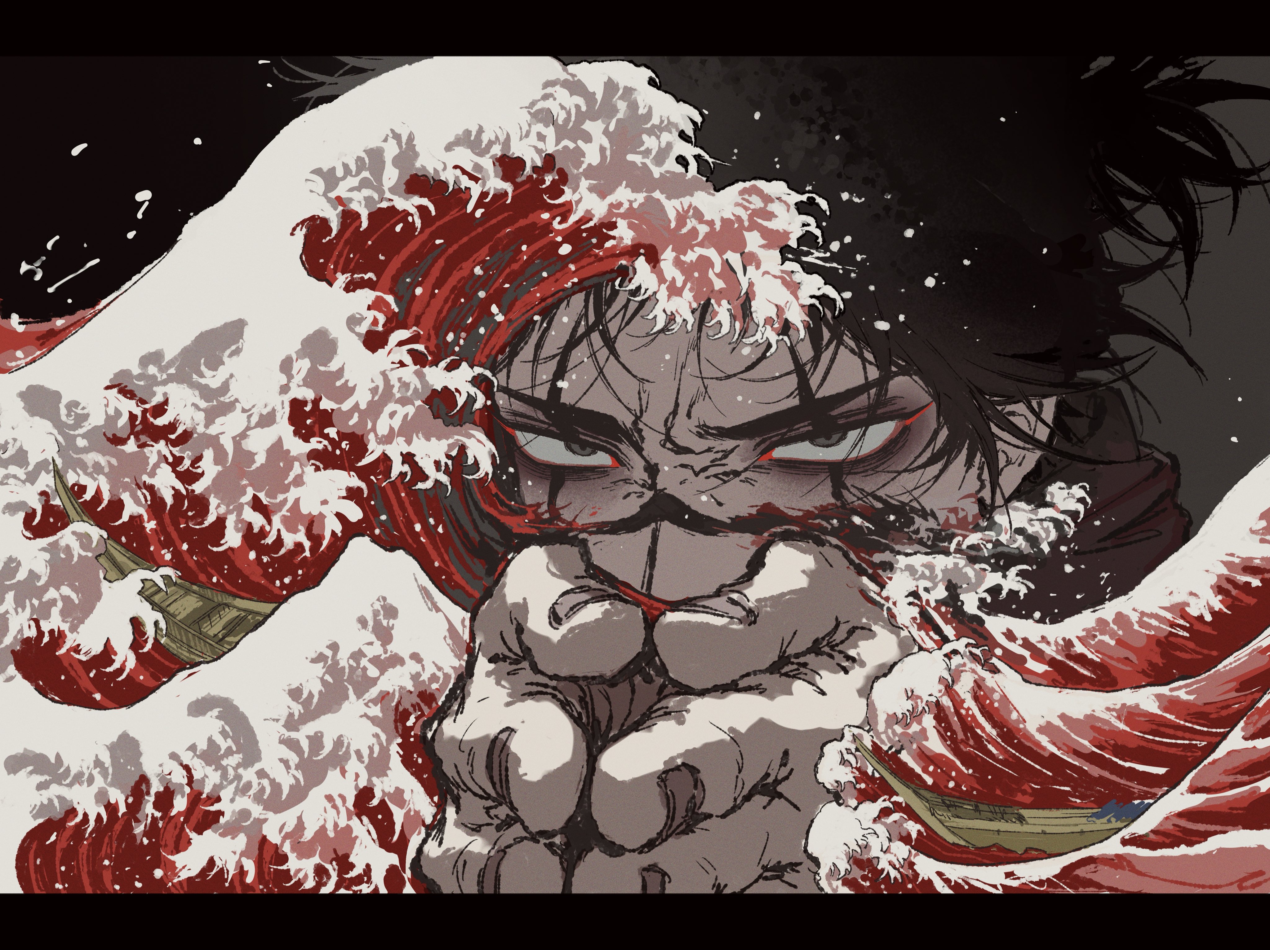 1boy absurdres bags_under_eyes bh20647 black_border black_hair boat border choso_(jujutsu_kaisen) facial_mark fine_art_parody hemokinesis highres jujutsu_kaisen kanagawa_okinami_ura letterboxed looking_at_viewer male_focus own_hands_together parody short_hair solo watercraft