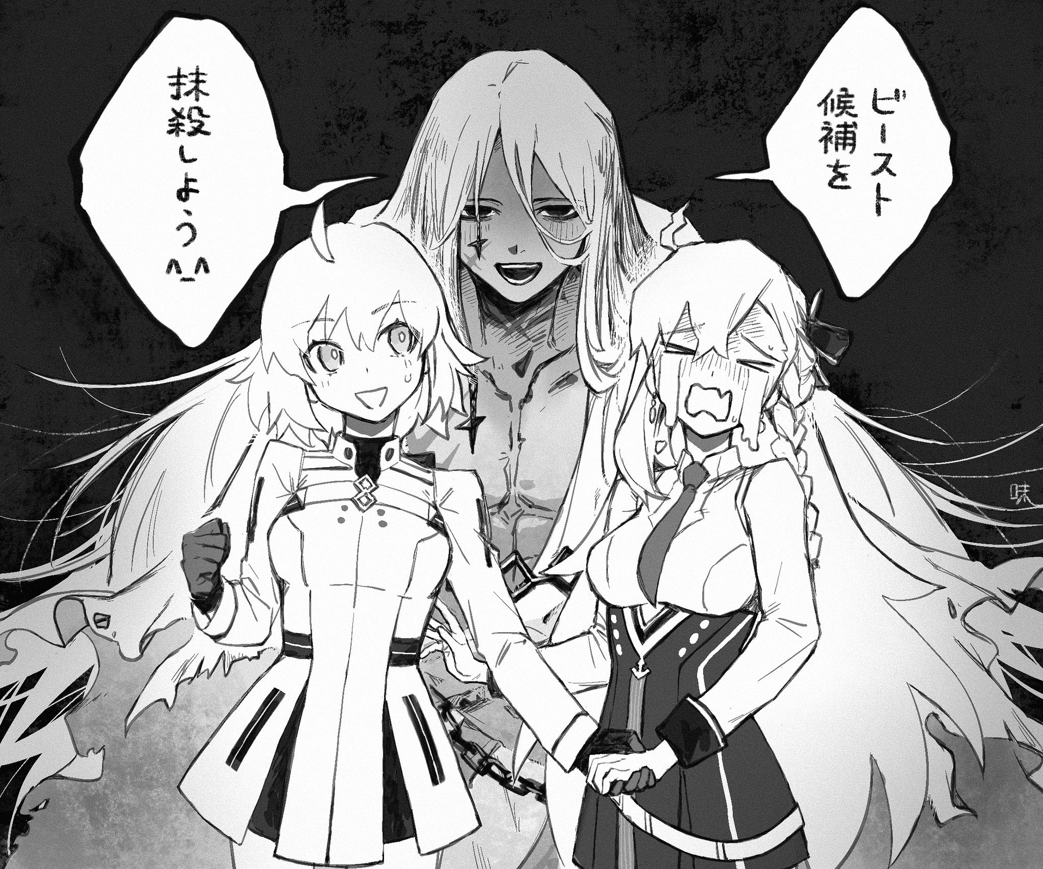 ^_^ ahoge azi_pra azrael_(grand_assassin)_(fate) bow braid breasts closed_eyes commentary_request crying dark-skinned_male dark_skin fate/grand_order fate_(series) fujimaru_ritsuka_(female) hair_bow highres holding_hands large_breasts long_hair muscular muscular_male necktie olga_marie_animusphere olga_marie_animusphere_(unbeast) scar scar_on_face smile sweatdrop twitching_ahoge very_long_hair