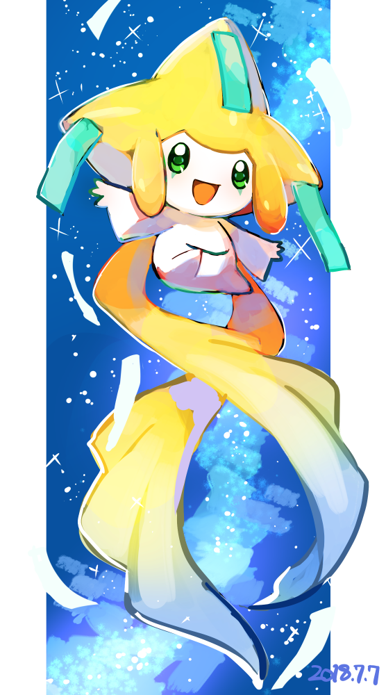 colored_skin commentary dated gen_3_pokemon happy jirachi legendary_pokemon mythical_pokemon nintendo no_humans pokemon pokemon_(creature) sky star_(sky) starry_sky third_eye chest_eye tpi_ri white_skin