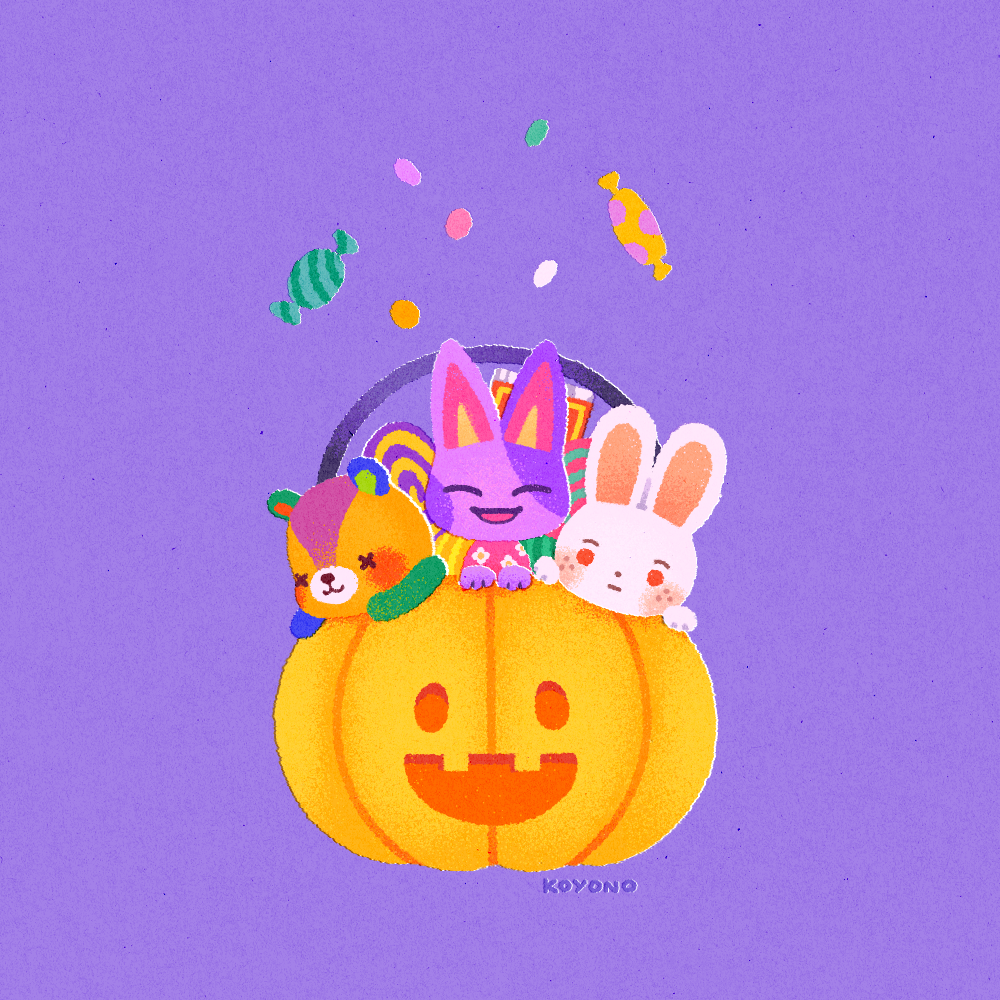 1girl 2boys animal_crossing artist_name bear bob_(animal_crossing) candy cat food halloween halloween_bucket koyono multiple_boys nintendo purple_background rabbit ruby_(animal_crossing) stitches_(animal_crossing) stuffed_animal stuffed_toy
