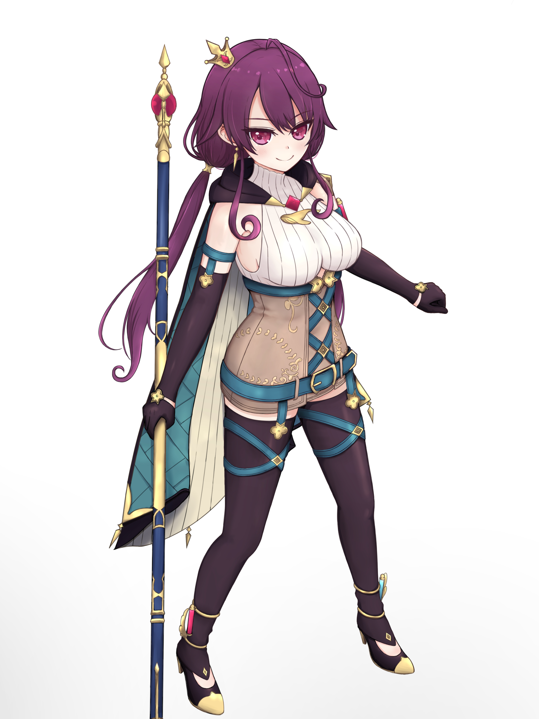 1girl absurdres ahoge atelier_(series) atelier_sophie atelier_sophie_2 belt blue_belt blue_cape breasts brown_gloves cape closed_mouth commentary elbow_gloves full_body gloves hand_up highres holding holding_staff large_breasts leotard long_hair looking_at_viewer low_twintails purple_eyes purple_hair ramizel_erlenmeyer signature simple_background smile solo staff thedesalizes twintails very_long_hair white_background