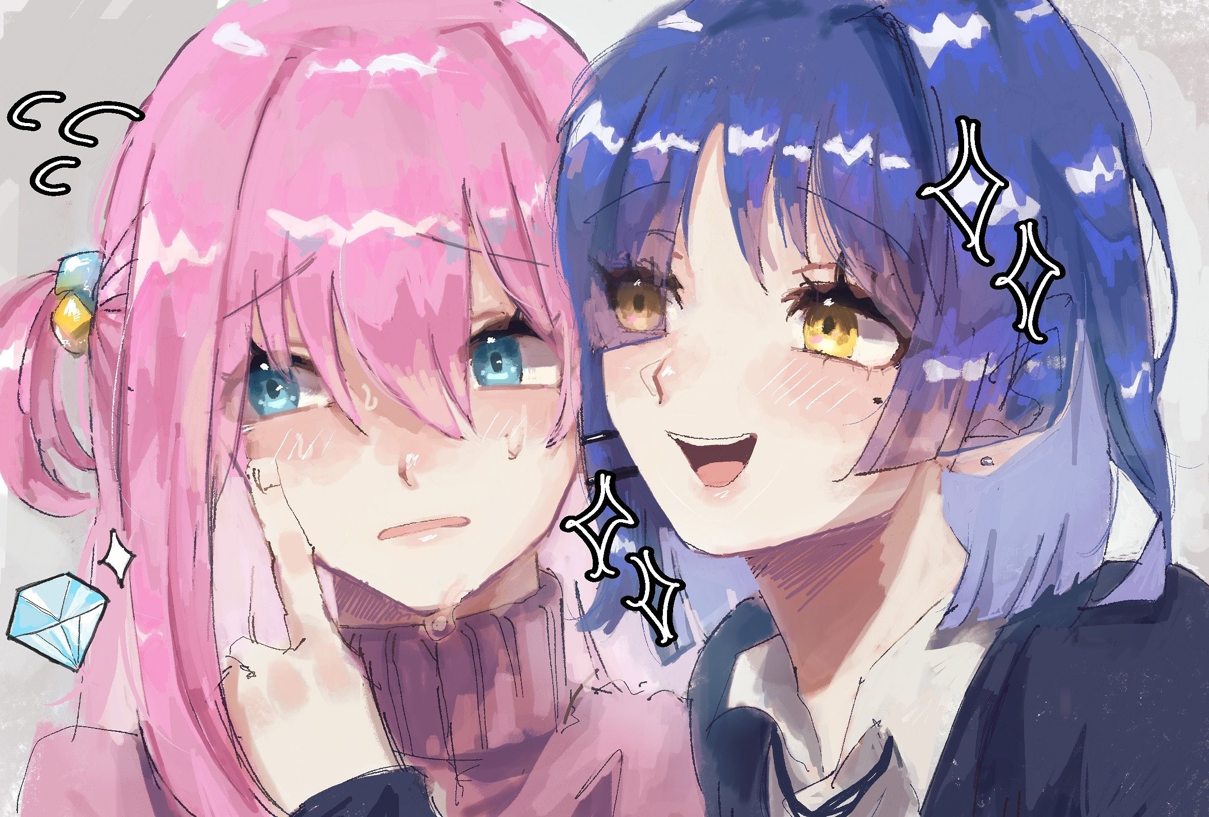 2girls black_ribbon black_sweater blue_eyes blue_hair blush bocchi_the_rock! commentary_request cube_hair_ornament diamond_(gemstone) earrings eyes_visible_through_hair flying_sweatdrops gotoh_hitori grey_background hair_between_eyes hair_ornament hairclip highres jacket jewelry long_hair long_sleeves looking_at_another mole mole_under_eye multiple_girls neck_ribbon nervous_sweating one_side_up open_mouth parallel_hairclips pink_hair pink_jacket ribbon shirt shirt_under_sweater short_hair smile sparkle stud_earrings sweat sweater tanaka_ruuchin track_jacket white_shirt yamada_ryo yellow_eyes