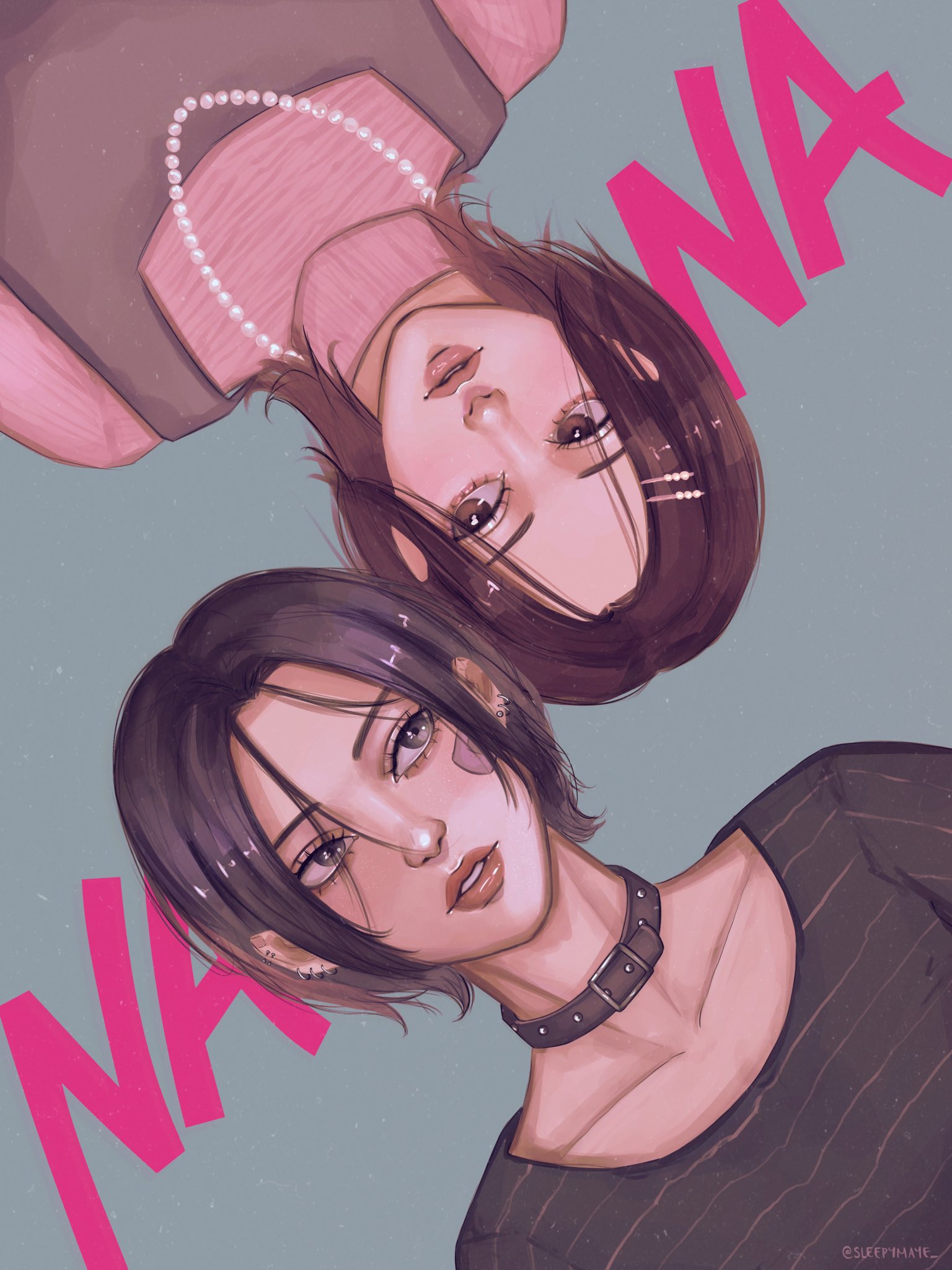 2girls bandaid bandaid_on_cheek bandaid_on_face black_choker black_hair black_shirt brown_dress brown_eyes brown_hair character_name choker copyright_name dress earrings grey_background grey_eyes hair_ornament hairclip hashtag-only_commentary highres jewelry komatsu_nana looking_at_another maye medium_hair multiple_earrings multiple_girls nana_(series) necklace osaki_nana parted_bangs parted_lips pearl_necklace pink_shirt shirt shirt_under_dress short_hair striped_clothes striped_shirt studded_choker turtleneck twitter_username upper_body