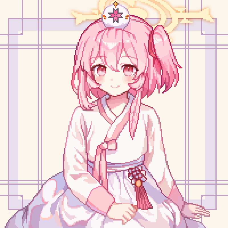 1girl alternate_costume blue_archive chima_(clothes) closed_mouth commentary feather_hair halo hanbok jeogori_(clothes) korean_clothes long_sleeves one_side_up pink_eyes pink_hair pink_skirt pixel_art serina_(blue_archive) short_hair sitting skirt smile solo tinia_etru upper_body yellow_halo