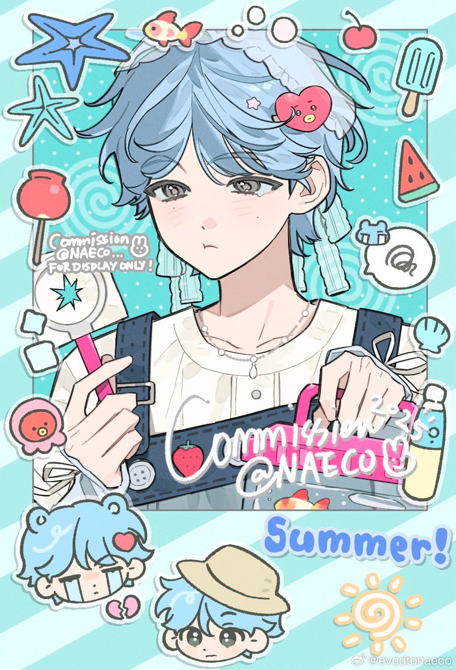 1girl blue_hair blush commentary_request evodtonaeco food hat highres holding original shirt short_hair smile tagme