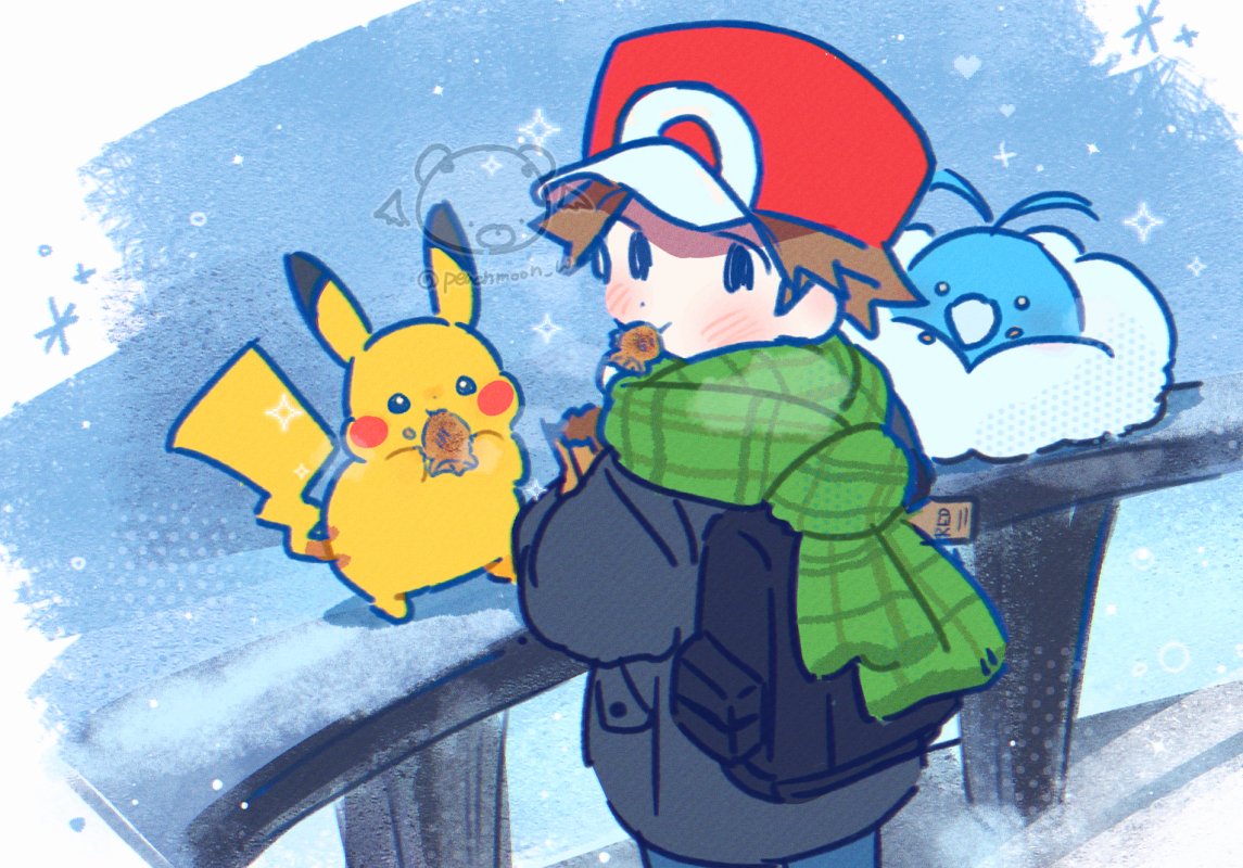1boy amesuupu backpack bag baseball_cap black_bag black_jacket blue_pants blush brown_hair commentary_request denim dot_nose eating food_in_mouth gen_1_pokemon gen_3_pokemon green_scarf hat jacket jeans looking_back male_focus nintendo outdoors pants patterned_clothing pikachu pokemon pokemon_frlg railing red_(pokemon) red_hat scarf short_hair snow snowflakes snowing solo standing swablu watermark