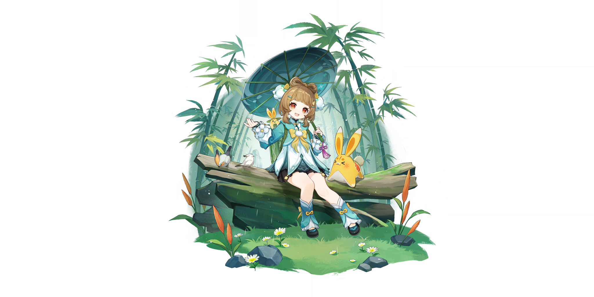 1girl :d bamboo bird black_shoes brown_eyes brown_hair flower game_cg genshin_impact grass green_shirt green_umbrella highres holding holding_umbrella long_sleeves looking_at_viewer non-web_source official_alternate_costume official_art open_mouth rock self-datamine shirt shoes short_hair simple_background sitting smile solo transparent_background umbrella white_flower yaoyao_(genshin_impact) yaoyao_(rainlit_bamboo_reverie)_(genshin_impact) yuegui_(genshin_impact)