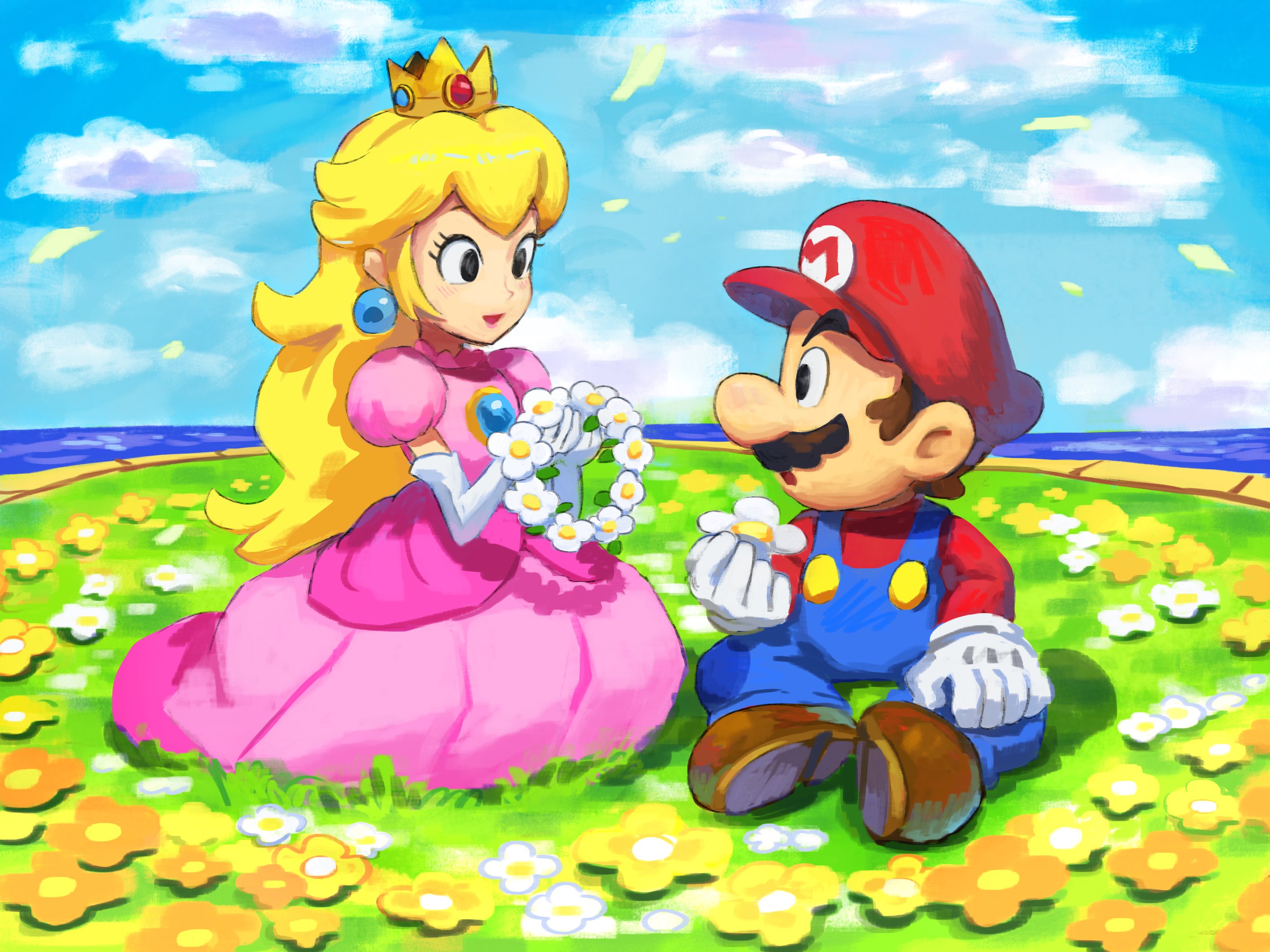 1boy 1girl blonde_hair blue_overalls blush brown_hair commentary crown dress earrings elbow_gloves facial_hair field flower flower_field gloves hat highres holding jewelry long_hair mario mario_&_luigi_rpg mario_(series) mustache nintendo open_mouth outdoors overalls pink_dress princess_peach red_hat red_shirt shirt short_hair sitting smile sphere_earrings untranslatable_commentary white_gloves yamari_(ya_mari_6363)