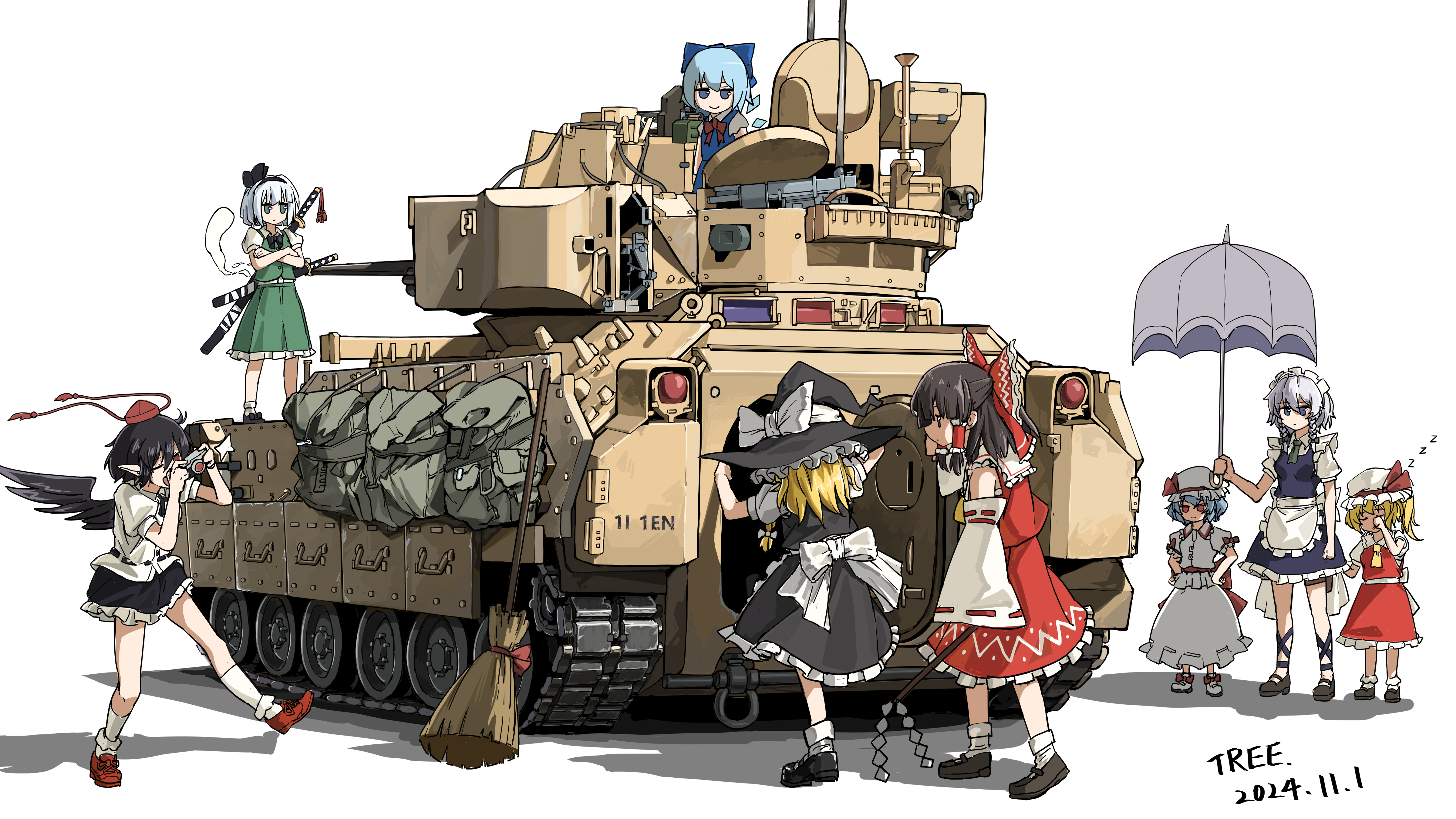 6+girls ;d absurdres apron backpack bag black_bow black_hair black_hairband black_hat black_shoes black_skirt black_wings blonde_hair blue_bow blue_dress blue_hair bow braid broom brown_hair camera chinese_commentary cirno closed_eyes closed_mouth commentary crawling crossed_arms dated detached_sleeves dress flandre_scarlet frilled_bow frilled_hair_tubes frilled_skirt frills from_behind gohei green_skirt green_vest grey_hair hair_bow hair_tubes hairband hakurei_reimu hands_on_own_hips hat highres holding holding_camera holding_gohei holding_umbrella imminent_stepping izayoi_sakuya jitome kirisame_marisa konpaku_youmu konpaku_youmu_(ghost) m2_bradley maid_headdress medium_hair military_vehicle multiple_girls missing_wings one_eye_closed open_hatch open_mouth puffy_short_sleeves puffy_sleeves radar red_bow red_shirt red_shoes red_skirt remilia_scarlet rubbing_eyes shadow shameimaru_aya shirt shoes short_hair short_sleeves sidelocks skirt sleepy smile socks tokin_hat touhou twin_braids umbrella user_yetd3785 vest white_apron white_background white_bow white_shirt white_shoes white_skirt white_socks wide_sleeves wings witch_hat zzz