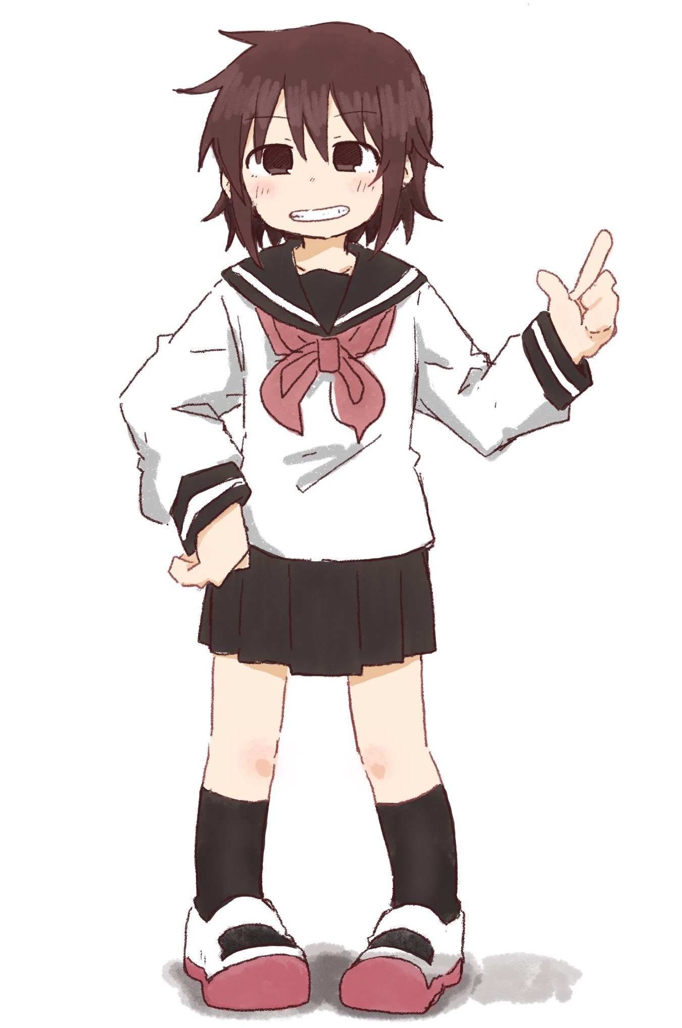 1girl black_sailor_collar black_skirt black_socks brown_eyes brown_hair collarbone female_focus flat_chest full_body grin hand_on_own_hip hand_up happy highres kneehighs kude_rei_(ponnu_(tnpn2yw)) long_sleeves matching_hair/eyes miniskirt neckerchief original pigeon-toed pleated_skirt ponnu_(tnpn2yw) red_neckerchief red_shoes sailor_collar school_uniform serafuku shirt shoes short_hair simple_background skirt smile socks solo standing teeth white_background white_shirt