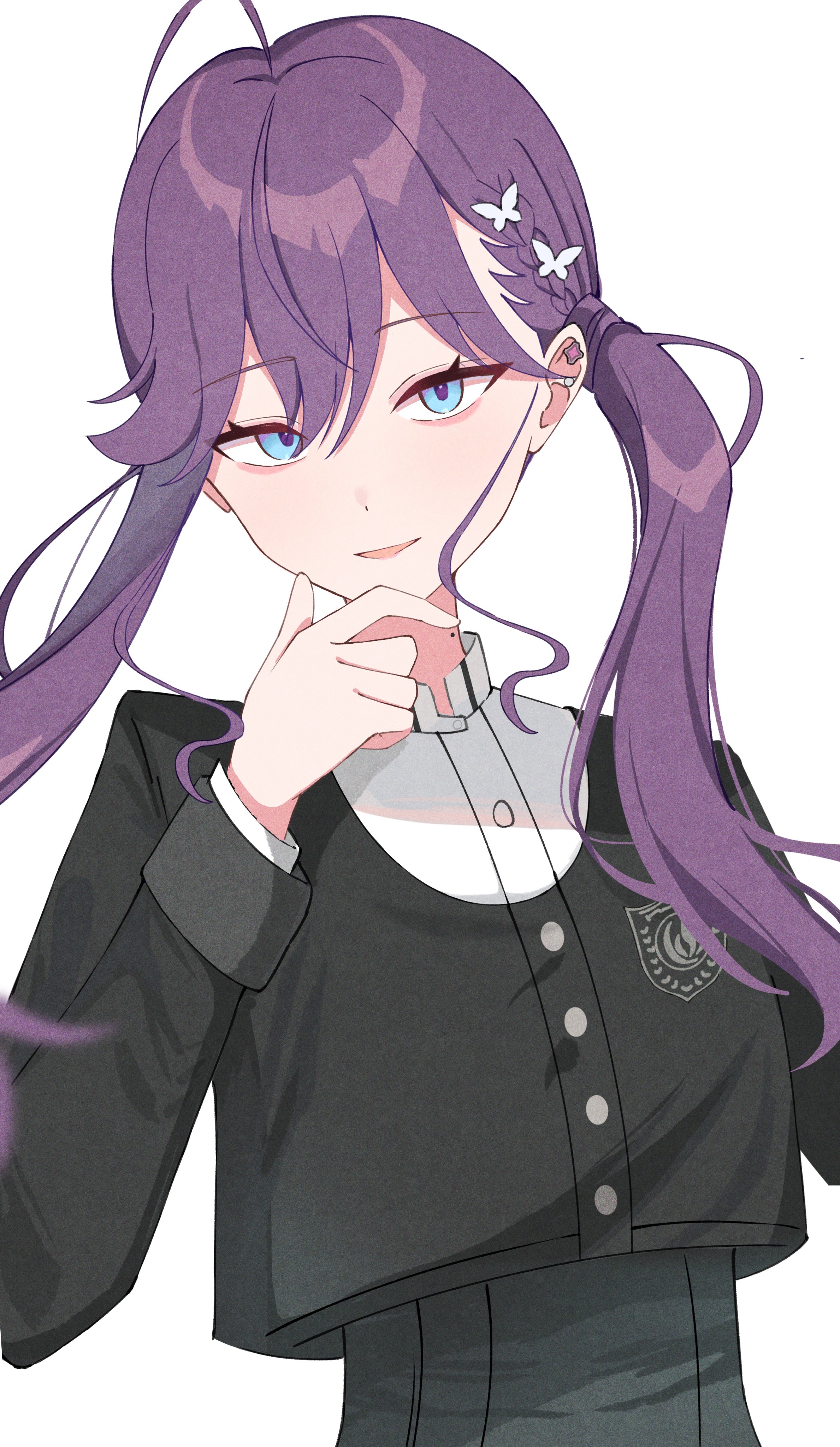 1girl absurdres ahoge bags_under_eyes black_jacket blue_eyes braid butterfly_hair_ornament collared_shirt commentary_request cropped_jacket ear_piercing gakuen_idolmaster gokugetsu_gakuen_school_uniform hair_ornament hand_on_own_chin highres idolmaster iroha_822 jacket kaya_rinha long_hair long_sleeves looking_at_viewer mole mole_on_neck parted_lips piercing purple_hair school_emblem school_uniform shirt side_braid simple_background solo twintails upper_body white_background white_shirt