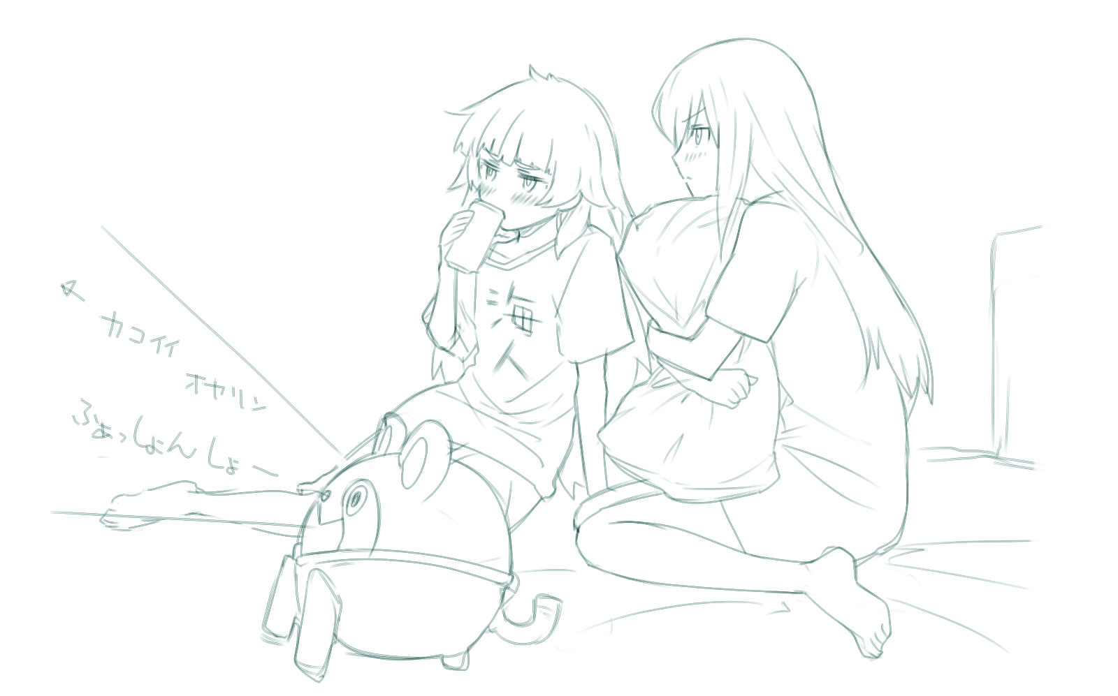 2girls barefoot blush commentary_request drinking drunk highres hiyajou_maho hugging_object kneeling long_hair loungewear makise_kurisu menomorute monochrome multiple_girls pillow pillow_hug science_adventure shirt short_sleeves steins;gate steins;gate_0 t-shirt upa_(steins;gate)