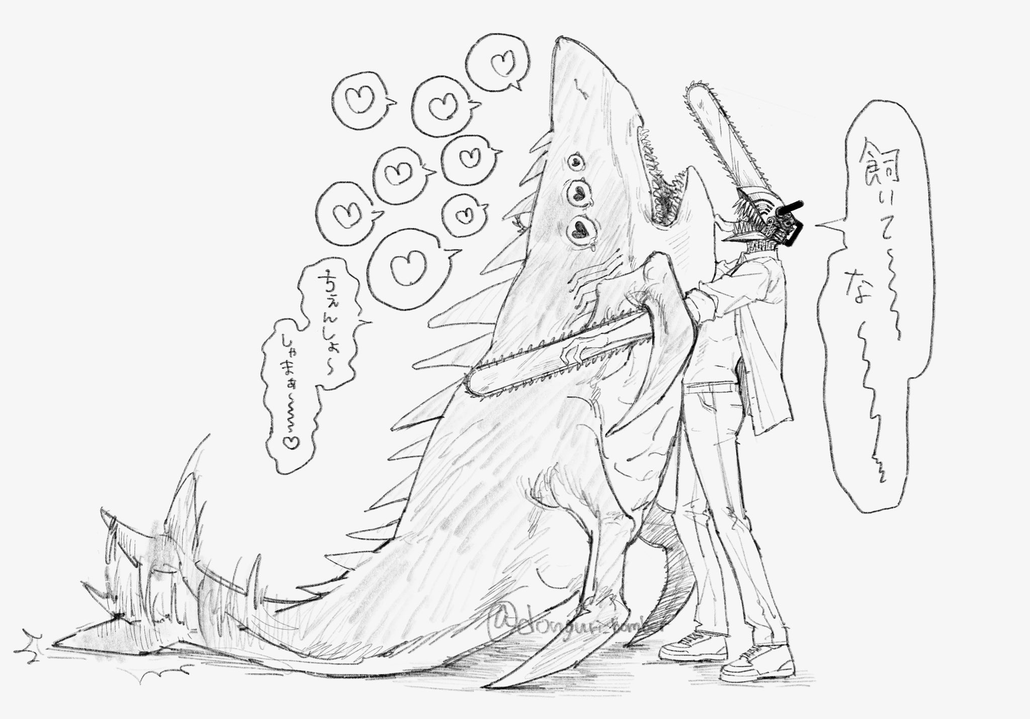 2boys beam_(chainsaw_man) chainsaw chainsaw_man collared_shirt commentary denji_(chainsaw_man) donguri_bomber from_side greyscale heart heart-shaped_pupils highres hug male_focus monochrome multiple_boys open_clothes open_shirt pants shark shirt simple_background speech_bubble spoken_heart untranslatable_commentary symbol-shaped_pupils tail tail_wagging transformation translation_request twitter_username white_background