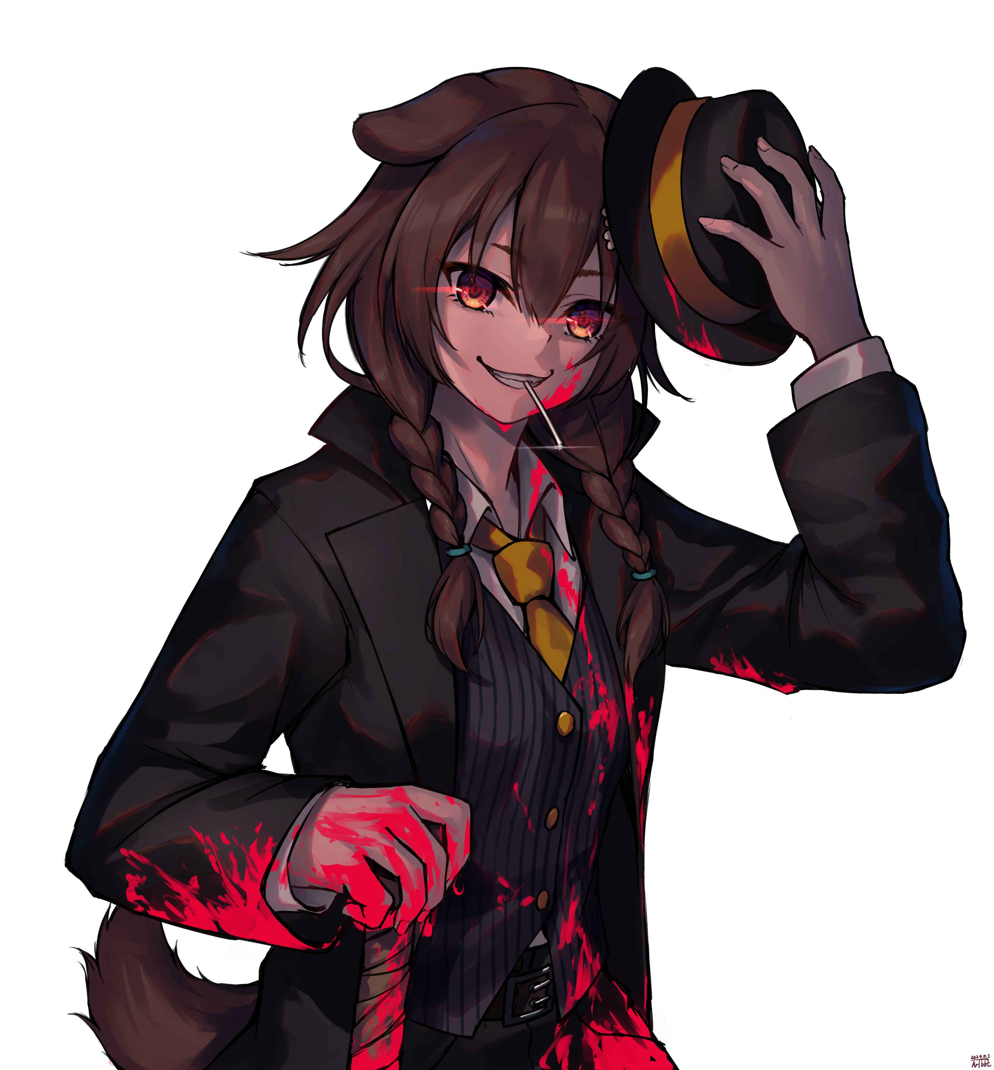 1girl absurdres animal_ears artist_name baseball_bat belt_collar beret black_coat black_hat black_vest blood blood_on_clothes blood_on_face blood_on_hands blood_stain bone_hair_ornament braid braided_twintails brown_eyes brown_hair coat collar commentary_request dated dog_ears dog_girl dog_tail double-parted_bangs evil_smile glowing glowing_eyes grin hair_between_eyes hair_ornament hairclip hat highres holding holding_baseball_bat holding_unworn_clothes holding_unworn_hat hololive inugami_korone long_hair low_twin_braids low_twintails mafia mouth_hold parallel_hairclips pinstripe_pattern pinstripe_vest signature simple_background smile solo tail transparent_background traveler_(artbbt) twin_braids twintails unworn_hat unworn_headwear vest virtual_youtuber waistcoat
