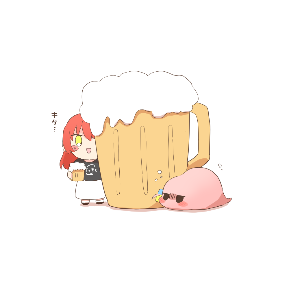alcohol beer beer_mug bocchi_the_rock! character_doll commentary_request cube_hair_ornament cup doll gotoh_hitori gotoh_hitori_(tsuchinoko) hair_ornament kessoku_band_t-shirt long_hair mug no_humans rebecca_(keinelove) red_hair simple_background white_background yellow_eyes