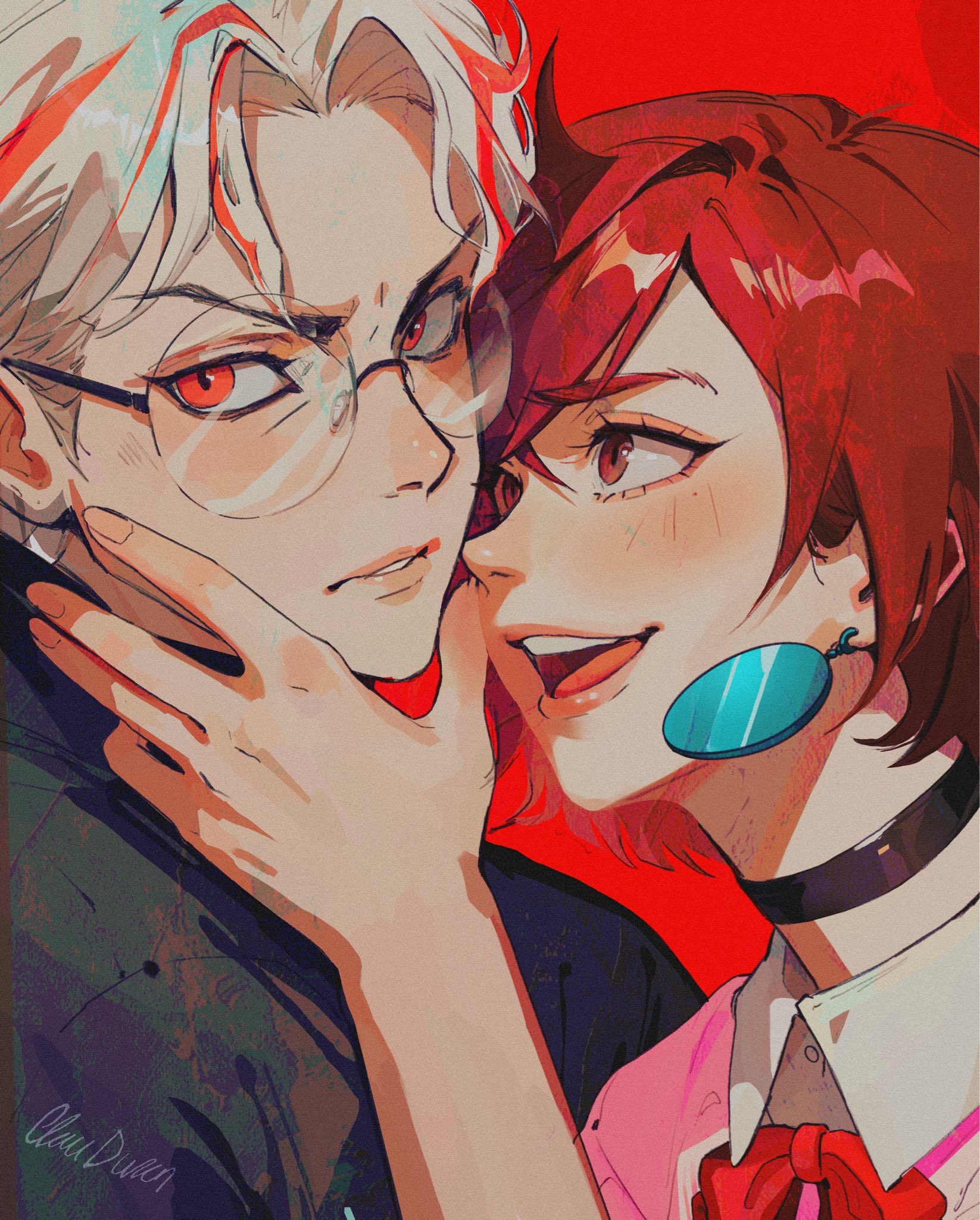 1boy 1girl artist_name ayase_momo black_choker black_jacket bow bowtie brown_eyes brown_hair choker clauduranart collared_shirt commentary crossed_bangs dandadan earrings english_commentary furrowed_brow glasses hair_between_eyes hand_on_another's_chin highres jacket jewelry multicolored_hair open_mouth parted_bangs parted_lips pink_sweater red_background red_bow red_bowtie red_eyes red_hair round_eyewear shirt shirt_under_sweater short_hair smile streaked_hair sweater takakura_ken_(dandadan) takakura_ken_(transformed)_(dandadan) upper_body white_hair white_shirt