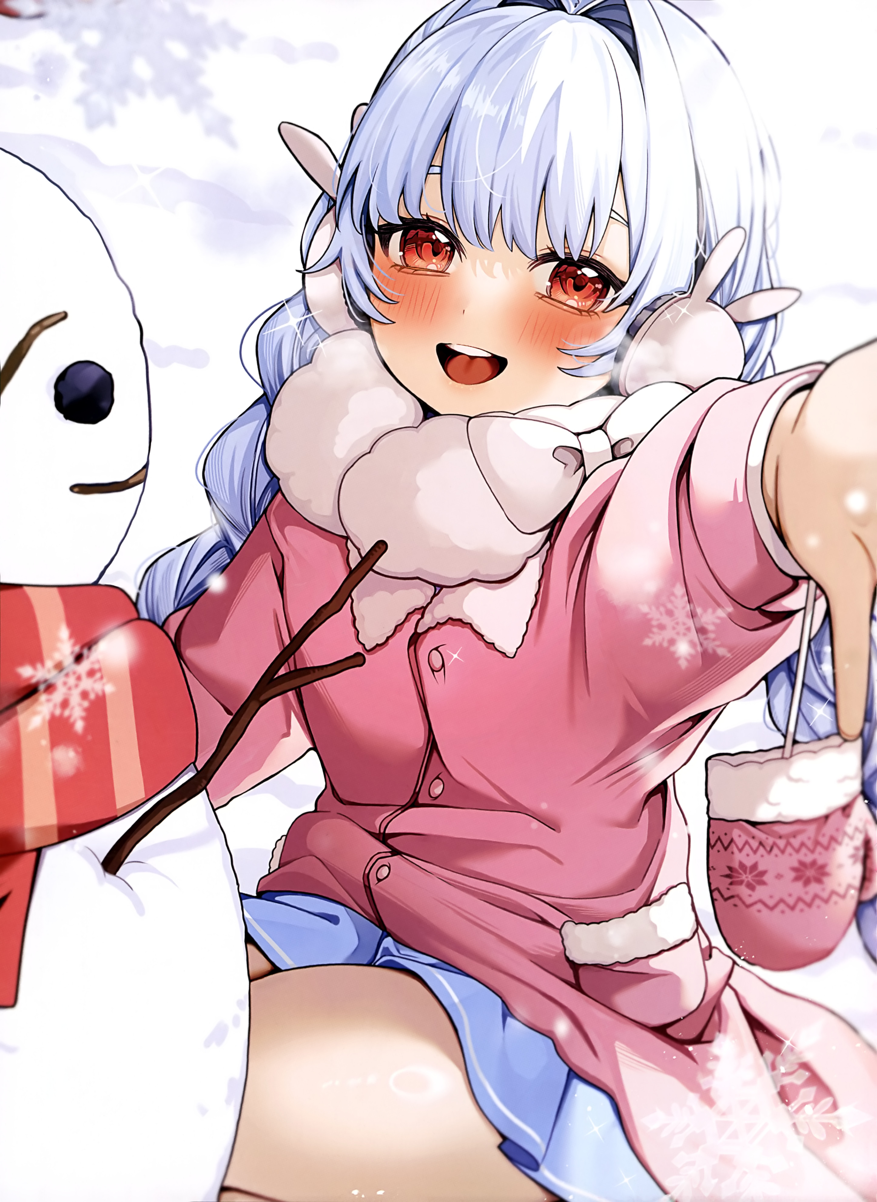 1girl :d absurdres blue_skirt blush braid coat dengeki_moeoh earmuffs hair_intakes highres long_hair looking_at_viewer low_twin_braids magazine_scan miniskirt mittens norisuke_(natto) open_mouth original outdoors outstretched_arm pink_coat pink_mittens rabbit_earmuffs reaching reaching_towards_viewer red_eyes scan skirt smile snow snowing snowman solo teeth third-party_source tongue twin_braids unworn_mittens upper_teeth_only white_hair winter_clothes