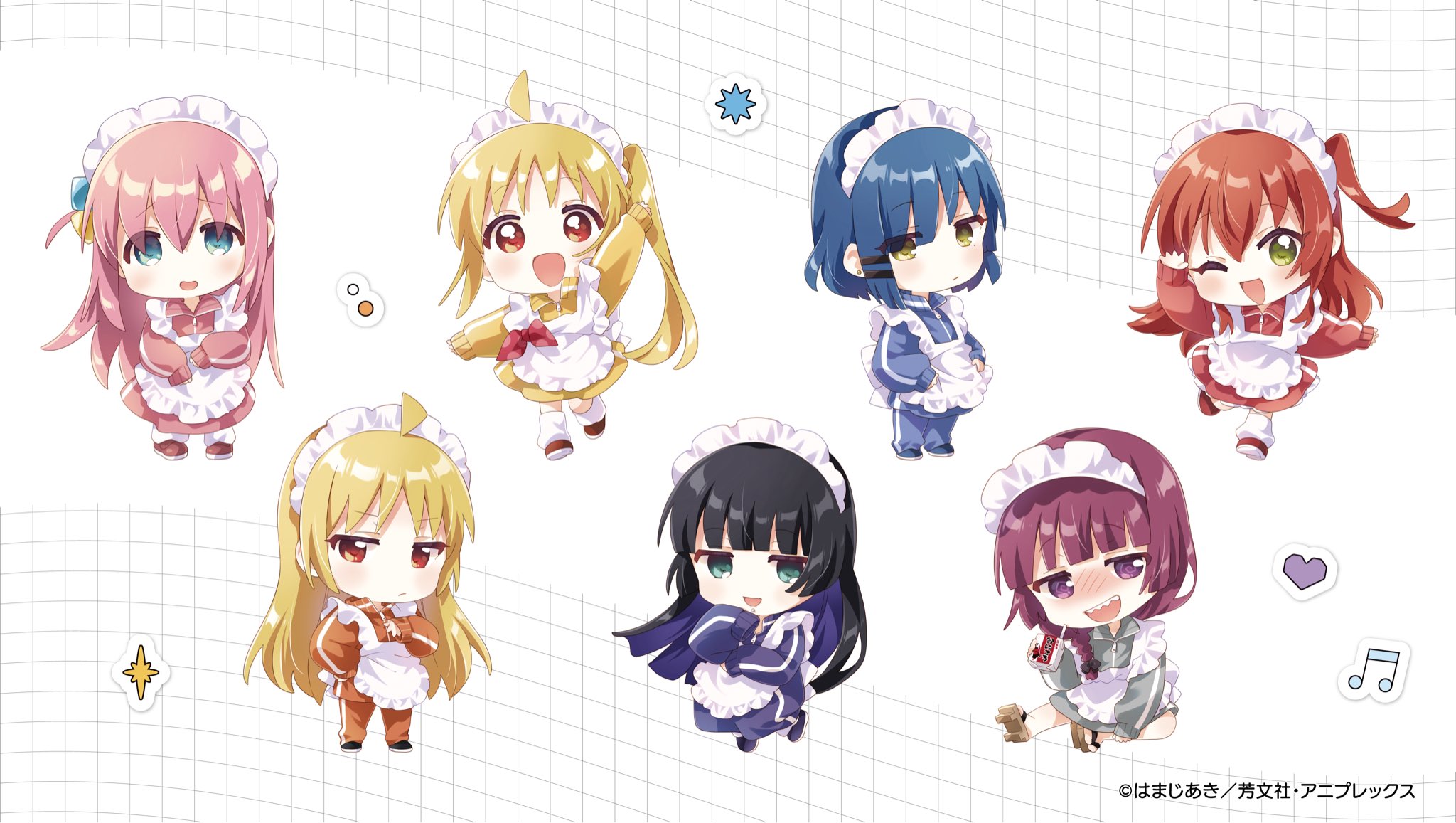 6+girls :d ;d ahoge alternate_costume apron black_hair black_shoes blonde_hair blue_eyes blue_hair blue_jacket blue_pants blue_shoes blunt_bangs blush bocchi_the_rock! brown_sandals brown_shoes chibi chibi_only closed_mouth commentary_request copyright_notice cube_hair_ornament enmaided frilled_apron frills full_body geta gotoh_hitori green_eyes green_skirt grid_background hair_between_eyes hair_ornament heart highres hiroi_kikuri ijichi_nijika ijichi_seika jacket jersey_maid kita_ikuyo long_hair long_sleeves looking_at_viewer maid maid_headdress multiple_girls musical_note namori nose_blush official_art one_eye_closed one_side_up open_mouth orange_jacket orange_pants pa-san pants pink_hair pink_jacket pink_skirt purple_eyes purple_hair purple_jacket purple_pants red_eyes red_hair red_jacket red_shoes red_skirt sandals sharp_teeth shoes short_hair side_ponytail sitting skirt smile socks sparkle standing standing_on_one_leg teeth track_jacket unconventional_maid upper_teeth_only white_apron white_background white_socks yamada_ryo yellow_eyes yellow_jacket yellow_skirt