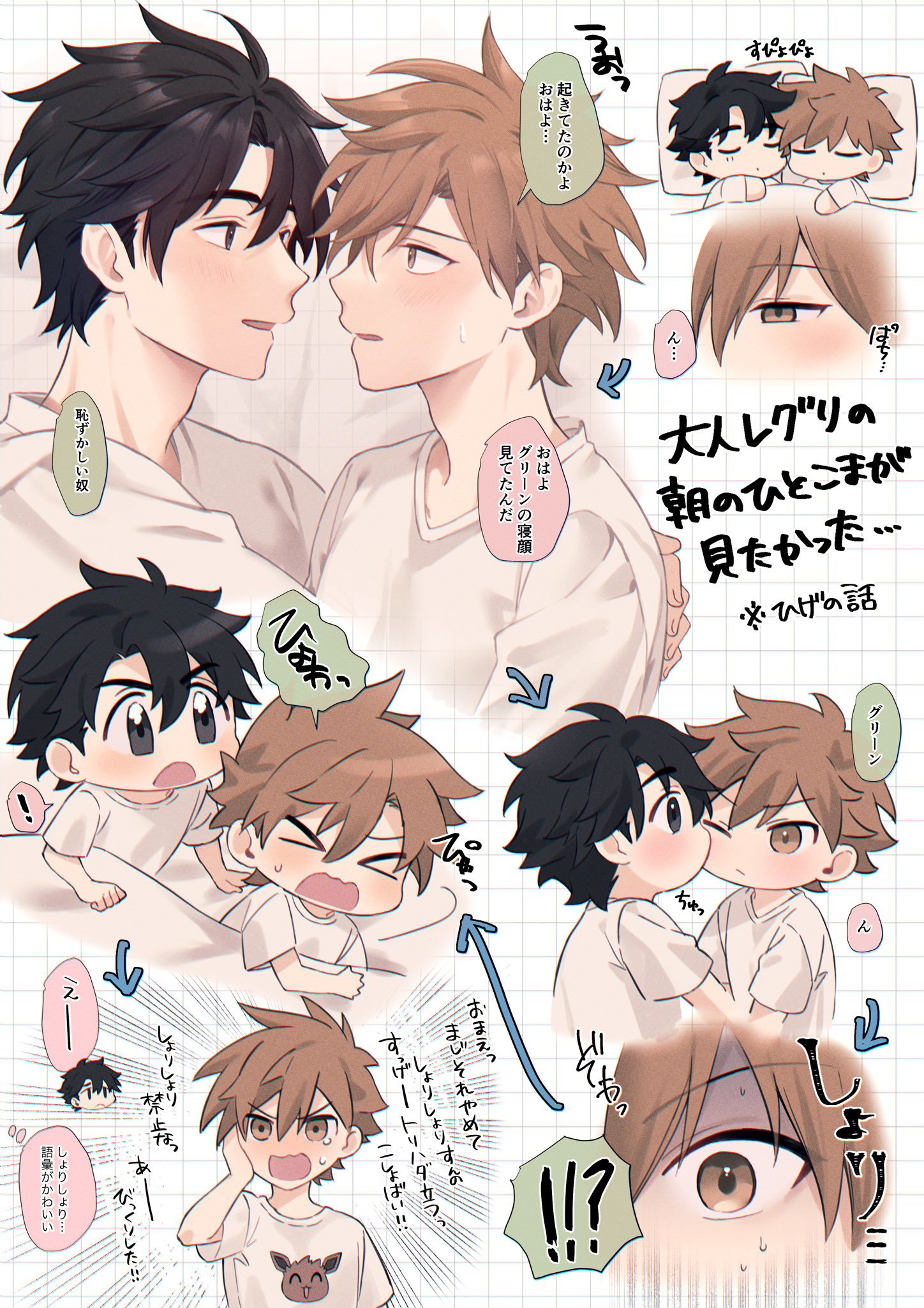 >_< 2boys arrow_(symbol) black_hair blue_oak blush brown_eyes brown_hair colored_speech_bubble commentary_request eye_contact grid_background hand_on_own_face highres kiss kissing_cheek looking_at_another lying male_focus multiple_boys multiple_views nintendo on_side open_mouth pillow pk_rgr96 pokemon pokemon_red/green/blue/yellow red_(pokemon) shirt sleeping speech_bubble translation_request under_covers v-neck white_shirt yaoi