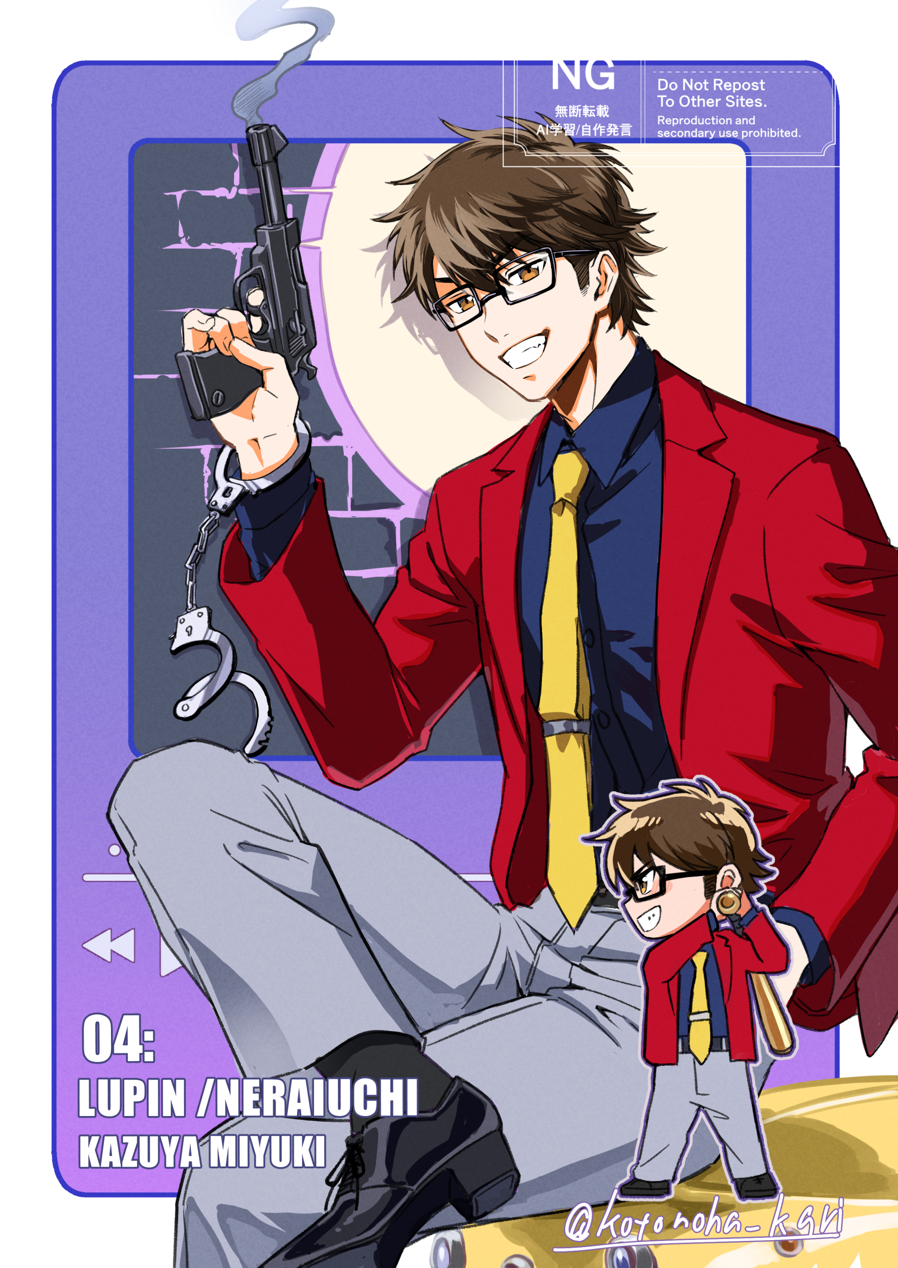 1boy absurdres ace_of_diamond black-framed_eyewear black_gloves black_pants blue_shirt border brown_eyes brown_hair collared_shirt commentary_request crossed_legs cuffs glasses gloves grey_pants grin gun handcuffs handgun highres holding holding_gun holding_weapon jacket kusatakesi looking_at_viewer male_focus miyuki_kazuya necktie pants rectangular_eyewear red_jacket shirt short_hair sitting smile walther walther_p38 watermark weapon white_border yellow_necktie