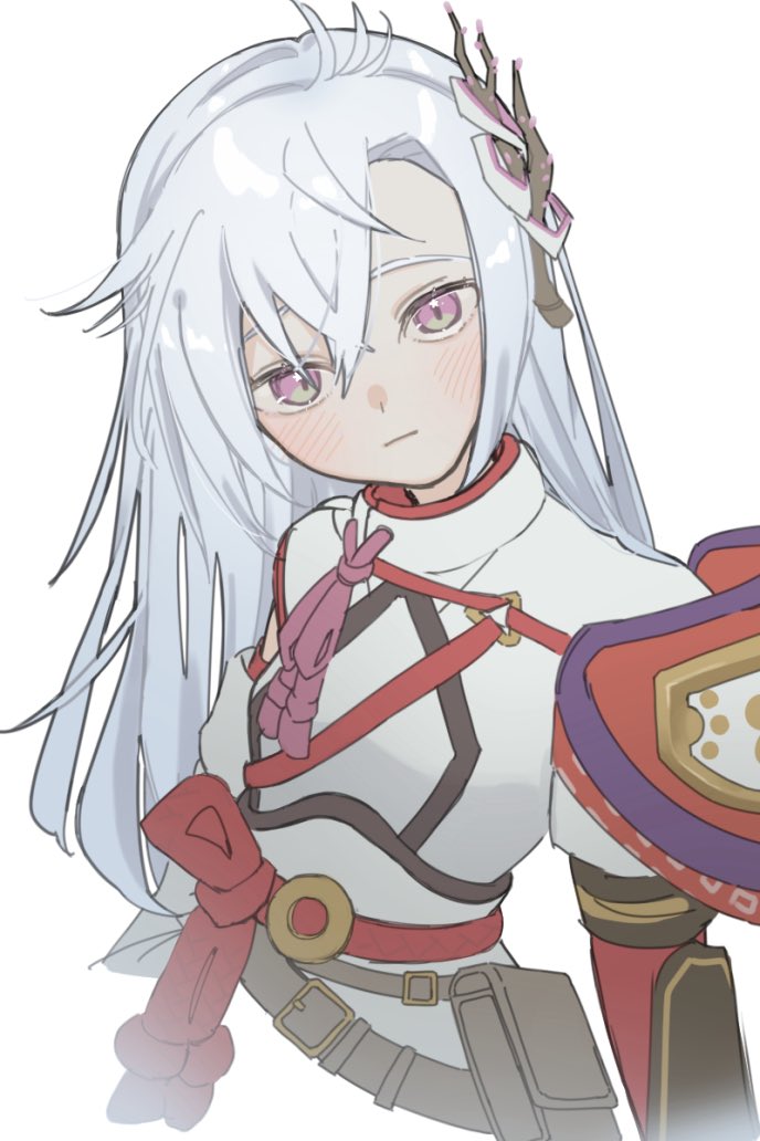1girl armor blush closed_mouth commentary_request cropped_legs hair_between_eyes hair_ornament japanese_armor japanese_clothes kaguya_(rune_factory) long_hair looking_at_viewer qsxj506 rune_factory rune_factory:_guardians_of_azuma simple_background solo upper_body very_long_hair white_background white_hair