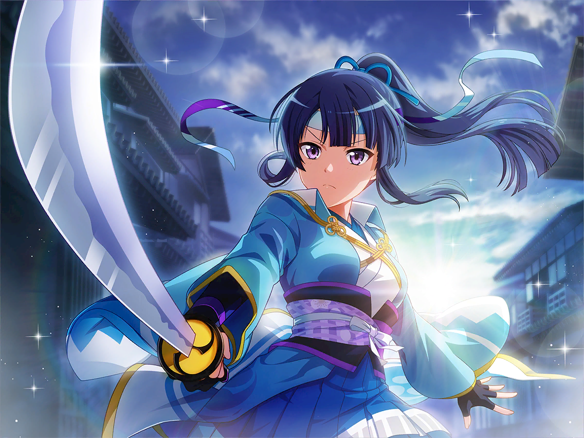 1girl black_gloves blue_haori blue_skirt closed_mouth cosplay fingerless_gloves floating_hair frown game_cg gloves haori headband hijikata_toshizou hijikata_toshizou_(cosplay) holding holding_sword holding_weapon japanese_clothes katana kimono long_sleeves looking_at_viewer morning obi official_art ponytail purple_eyes purple_hair sash shinsengumi shoujo_kageki_revue_starlight shoujo_kageki_revue_starlight_-re_live- skirt solo standing sun sword tomoe_tamao upper_body v-shaped_eyebrows weapon white_headband white_kimono wide_shot