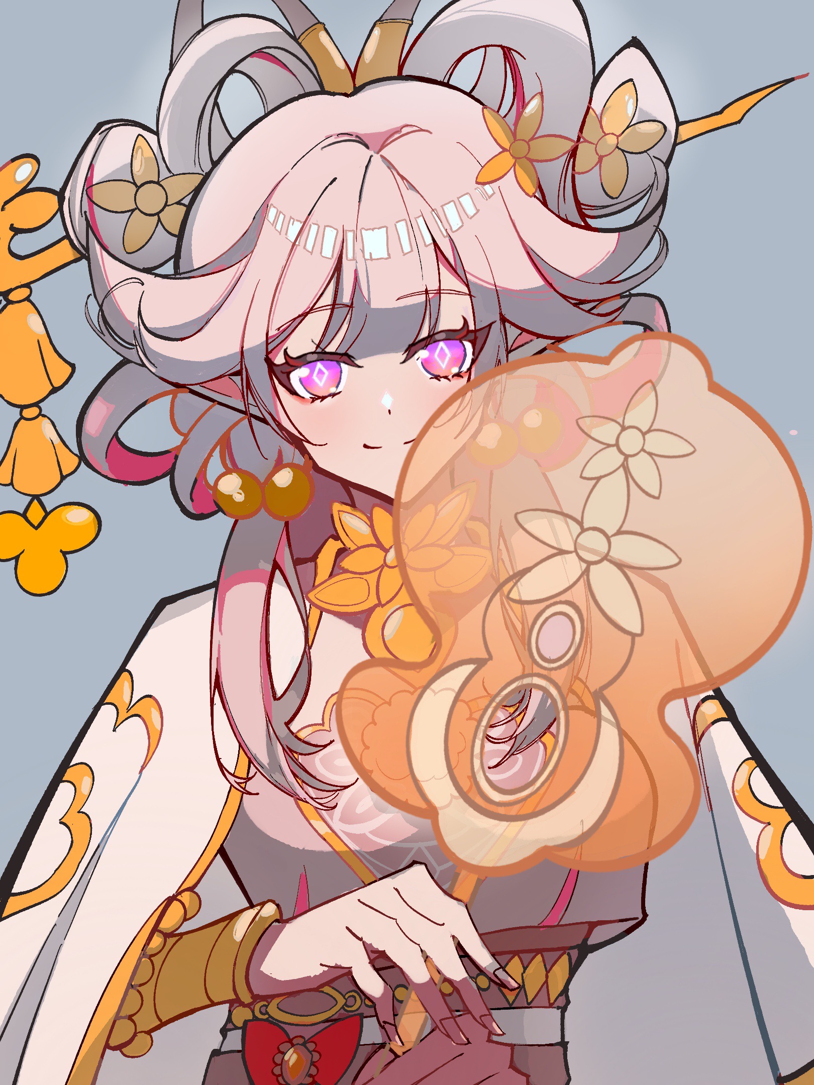 1girl breasts chinese_clothes chinese_commentary chinese_hairstyle commentary_request diamond-shaped_pupils diamond_(shape) dress earrings elysia_(hi_love_elf)_(honkai_impact) elysia_(honkai_impact) elysia_(lunar_grace)_(honkai_impact) feixianji_(hairstyle) flower gigin335 grey_background grey_hair hair_flower hair_ornament hair_rings hand_fan highres holding holding_fan honkai_(series) honkai_impact_3rd jewelry large_breasts long_hair looking_at_viewer official_alternate_costume pink_dress purple_eyes simple_background smile solo symbol-shaped_pupils very_long_hair