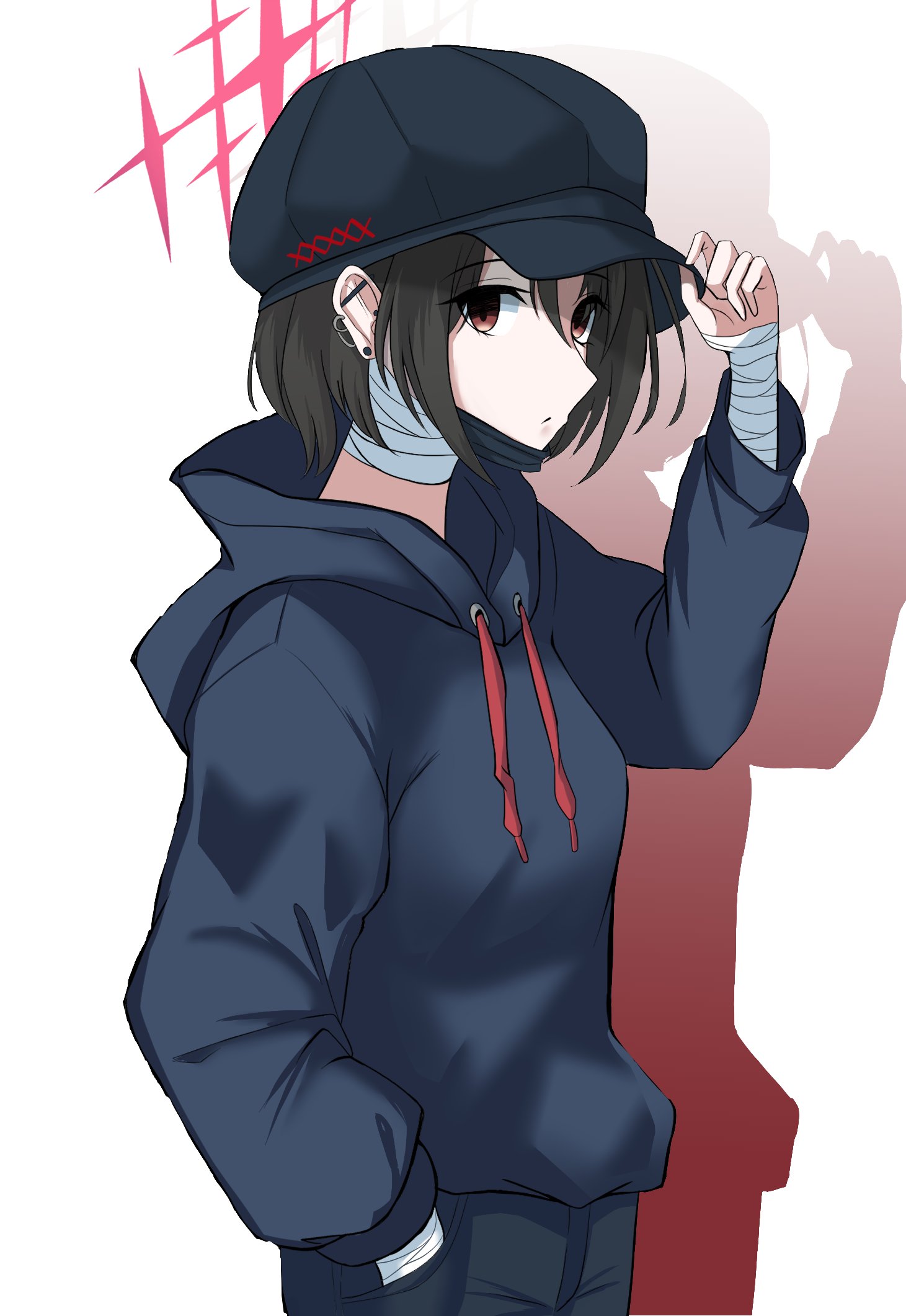 bad_link bdsm beret black_hair black_jacket blue_archive bondage bound core1013 halo hand_in_pocket hand_on_own_hat hat highres jacket looking_at_viewer misaki_(blue_archive) red_eyes red_halo shadow