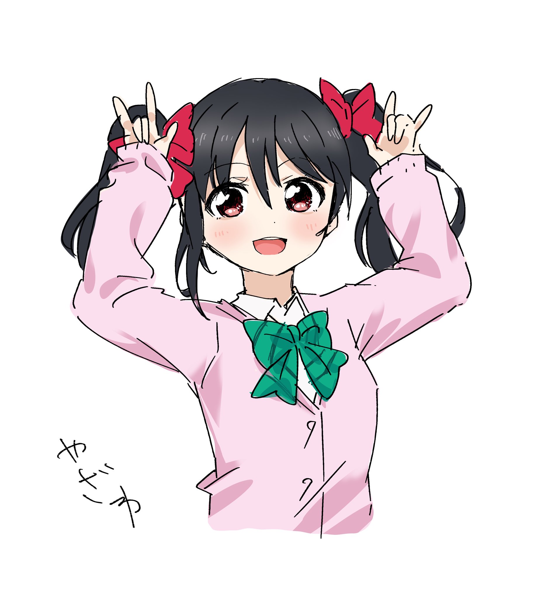 1girl \m/ arms_up black_hair bow bowtie cardigan character_name collared_shirt commentary_request diagonal-striped_bow diagonal-striped_bowtie diagonal-striped_clothes double_\m/ green_bow green_bowtie hair_bow highres kaeru_dx long_sleeves looking_at_viewer love_live! love_live!_school_idol_project medium_hair nico_nico_nii otonokizaka_school_uniform pink_cardigan pink_eyes red_bow school_uniform shirt simple_background solo striped_bow striped_bowtie striped_clothes translated twintails white_background white_shirt winter_uniform yazawa_nico