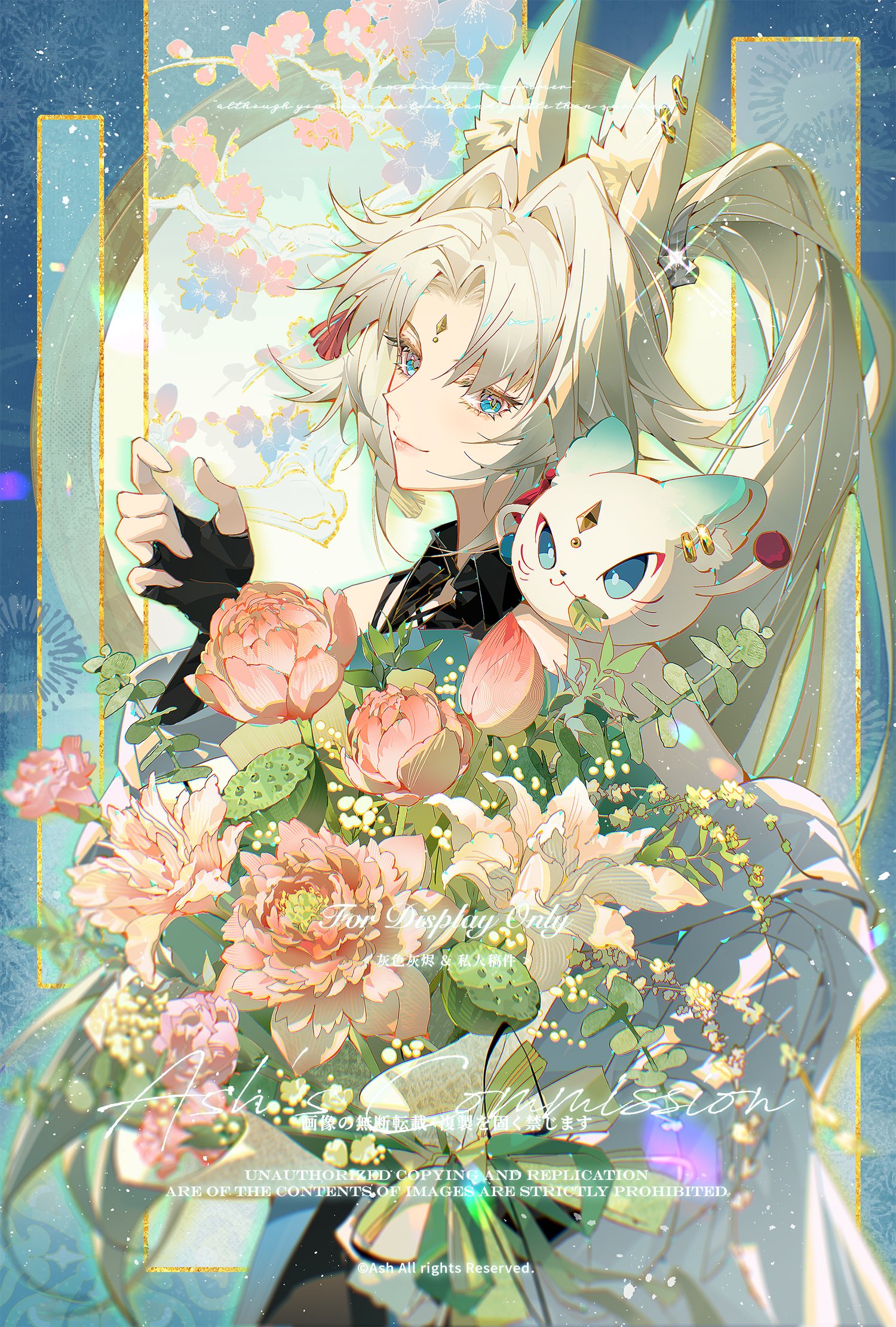 1girl animal animal_ears animal_on_shoulder animalization black_gloves black_shirt blue_eyes bouquet closed_mouth commentary commission cowboy_shot feixiao_(honkai:_star_rail) fingerless_gloves flower forehead_jewel fox_ears fox_girl gloves hair_intakes high_ponytail highres holding holding_bouquet honkai:_star_rail honkai_(series) indai_(3330425) jacket jacket_partially_removed long_hair looking_at_viewer person_and_animalization pink_flower ponytail shirt smile sparkle watermark white_hair white_jacket wing_collar