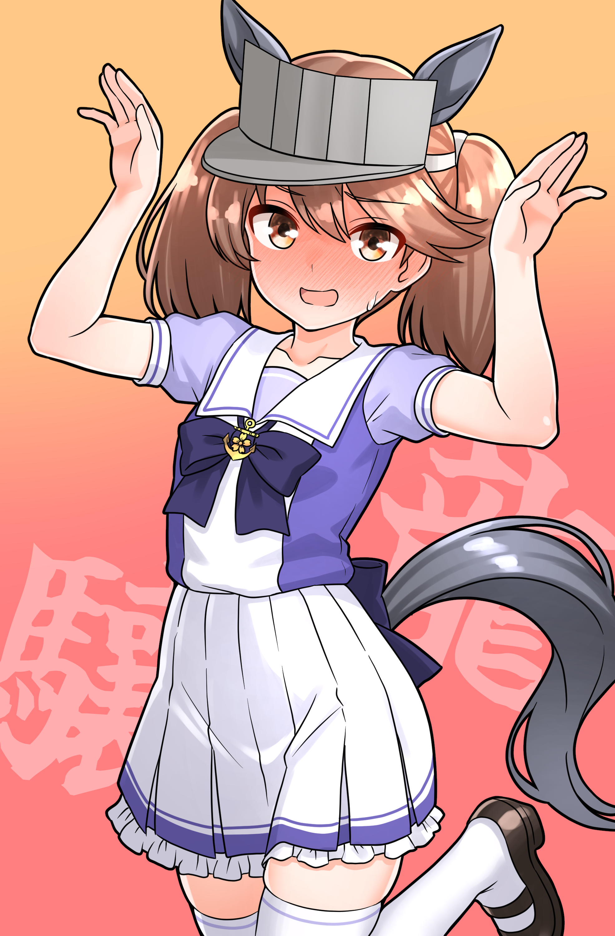 1girl absurdres animal_ears back_bow black_shoes bow bowtie brown_eyes brown_hair commentary_request embarrassed fake_animal_ears fake_tail furaggu_(frag_0416) grey_hat hat highres horse_ears horse_tail horseshoe_ornament kantai_collection large_bow mary_janes navel pleated_skirt puffy_short_sleeves puffy_sleeves purple_bow purple_bowtie purple_shirt ryuujou_(kancolle) sailor_collar sailor_shirt school_uniform serafuku shirt shoes short_sleeves skirt solo standing standing_on_one_leg stomach tail thighhighs tracen_school_uniform umamusume variant_set visor_cap white_skirt white_thighhighs