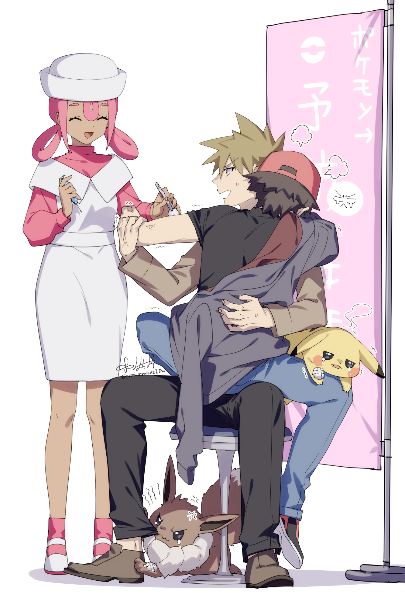 1girl 2boys 88_(einnimnech) :d alternate_costume black_pants black_shirt blue_oak brown_hair closed_eyes commentary_request dress eevee gen_1_pokemon highres jacket joy_(pokemon) knees multiple_boys nintendo open_mouth pants pikachu pink_hair pink_shirt pink_socks pokemon pokemon_(creature) pokemon_legends:_z-a pokemon_red/green/blue/yellow puff_of_air red_(pokemon) shirt shoes short_hair sitting smile socks spiked_hair stool white_dress white_shoes yaoi