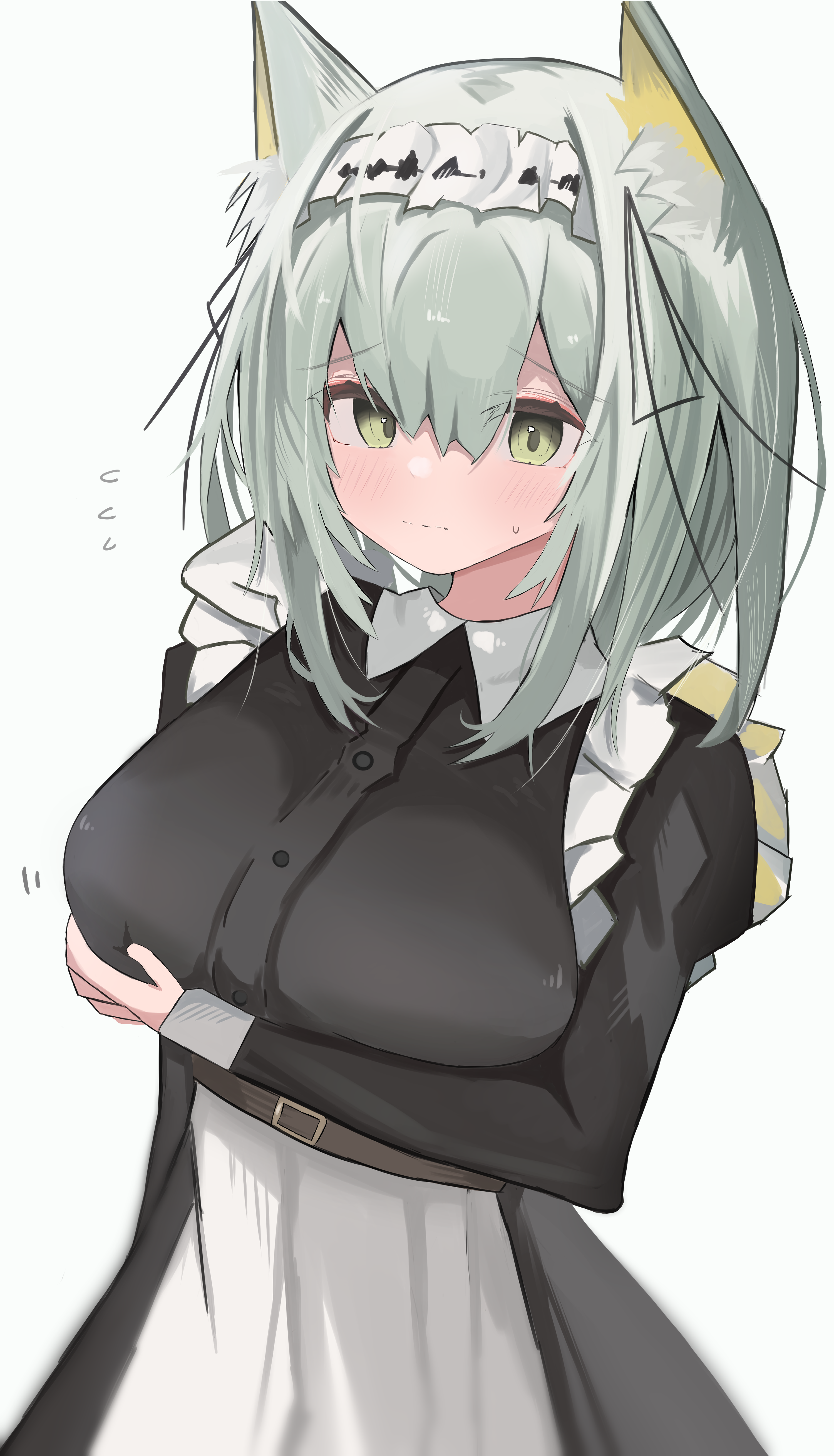 1girl :| absurdres animal_ear_fluff animal_ears arknights black_dress breasts cat_ears censored closed_mouth commentary_request dress green_eyes green_hair highres kal'tsit_(arknights) large_breasts long_hair looking_at_viewer maid maid_headdress nui_(nuinui0300) simple_background variant_set white_background