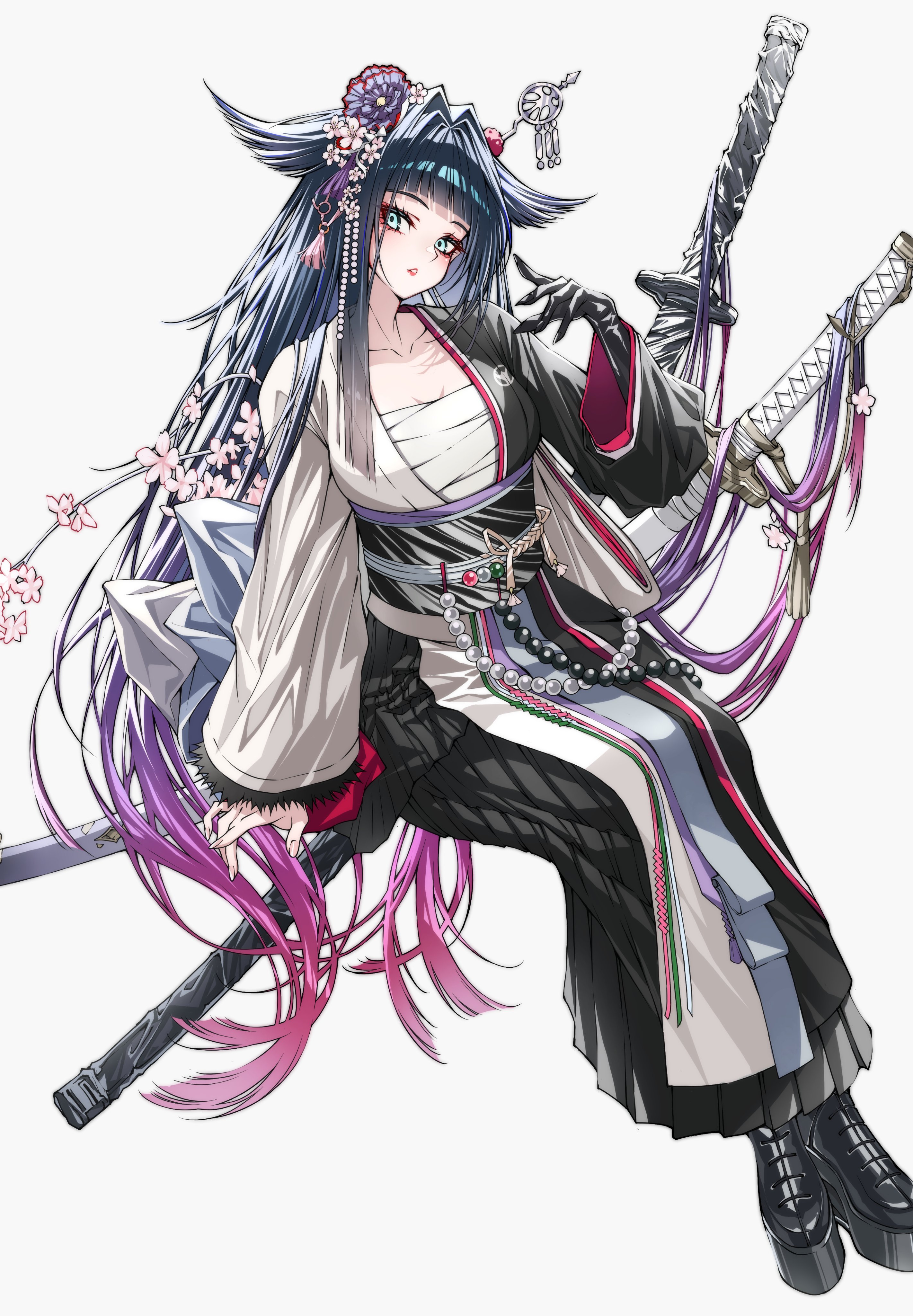 1girl absurdres arknights blue_eyes blunt_bangs breasts commentary_request flower full_body gloves hair_flower hair_ornament highres japanese_clothes kimono large_breasts long_hair long_sleeves makeup mio_(arknights) multicolored_hair shokikanes simple_background single_glove solo two-tone_hair very_long_hair white_background wide_sleeves