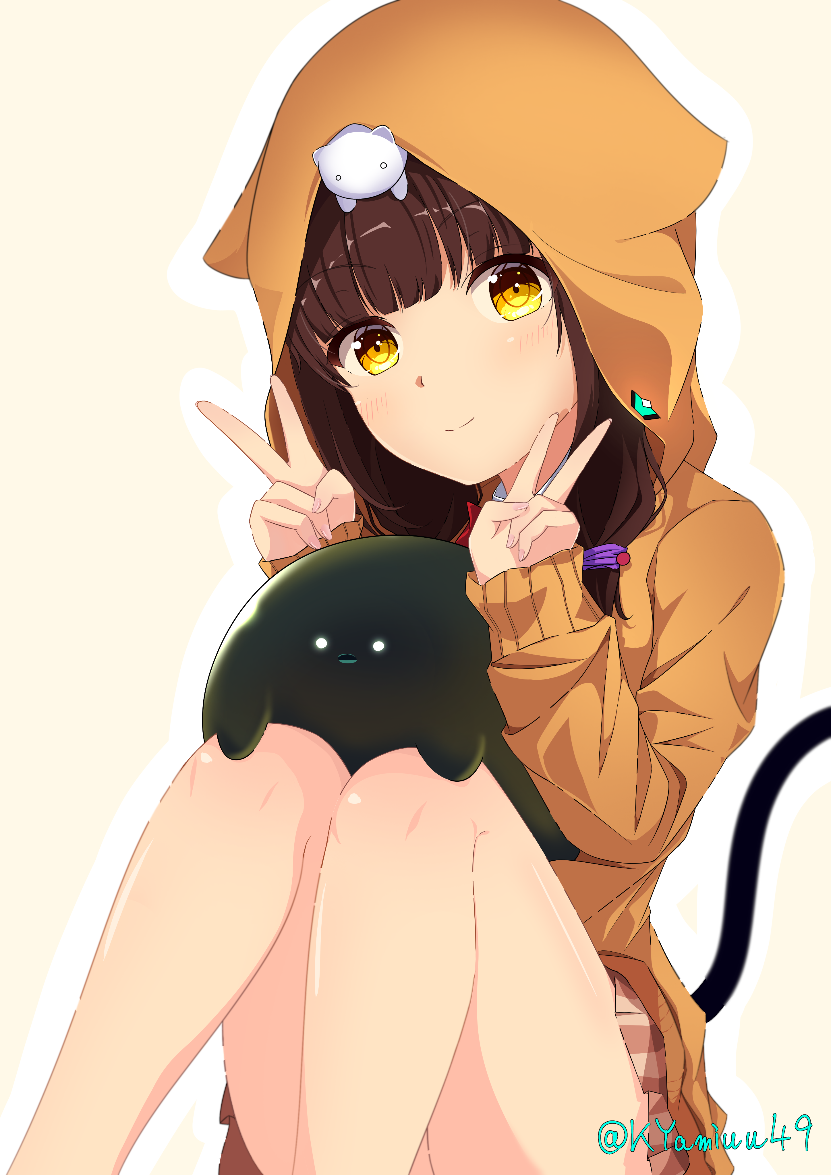 absurdres asakura_karen_(heaven_burns_red) black_hair brown_hair cat_tail commentary_request double_v heaven_burns_red highres hood hooded_jacket jacket kyamiuu low_twintails narby_(heaven_burns_red) simple_background sitting smile tail thighs twintails v white_background yellow_eyes
