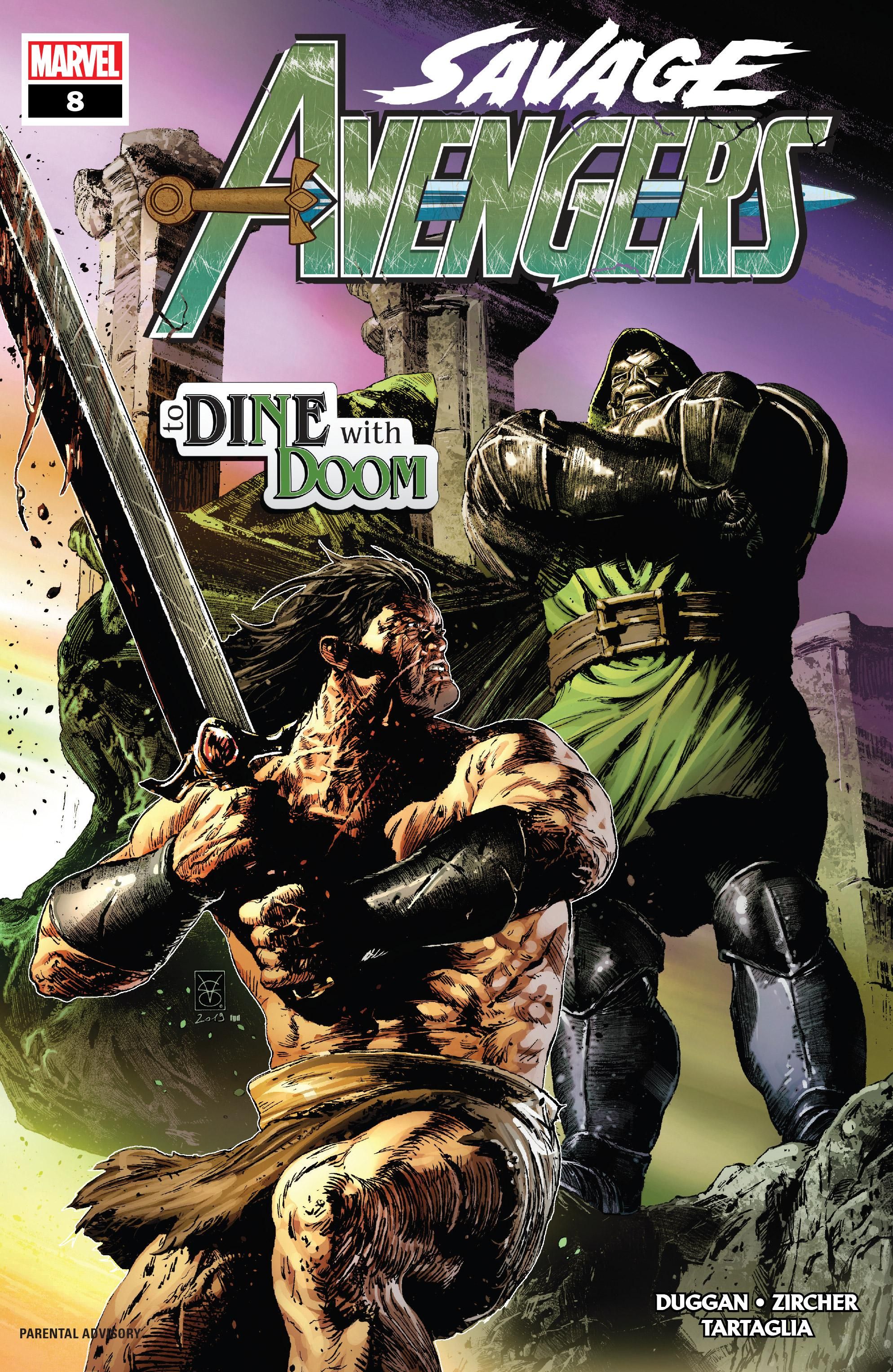 2018 2boys absurdres architecture armor artist_name barbarian black_hair cape comic_cover conan_(series) conan_the_barbarian crossed_arms dated doctor_doom english_text fantastic_four full_armor fur-trimmed_armor fur_trim greco-roman_architecture green_hood green_tunic grey_mask highres holding holding_sword holding_weapon hood hooded_cape loincloth long_hair marvel mask metal_mask multiple_boys muscular muscular_male pillar power_armor sidelighting signature sunlight superhero_costume sword tunic valerio_giangiordano weapon western_comics_(style)