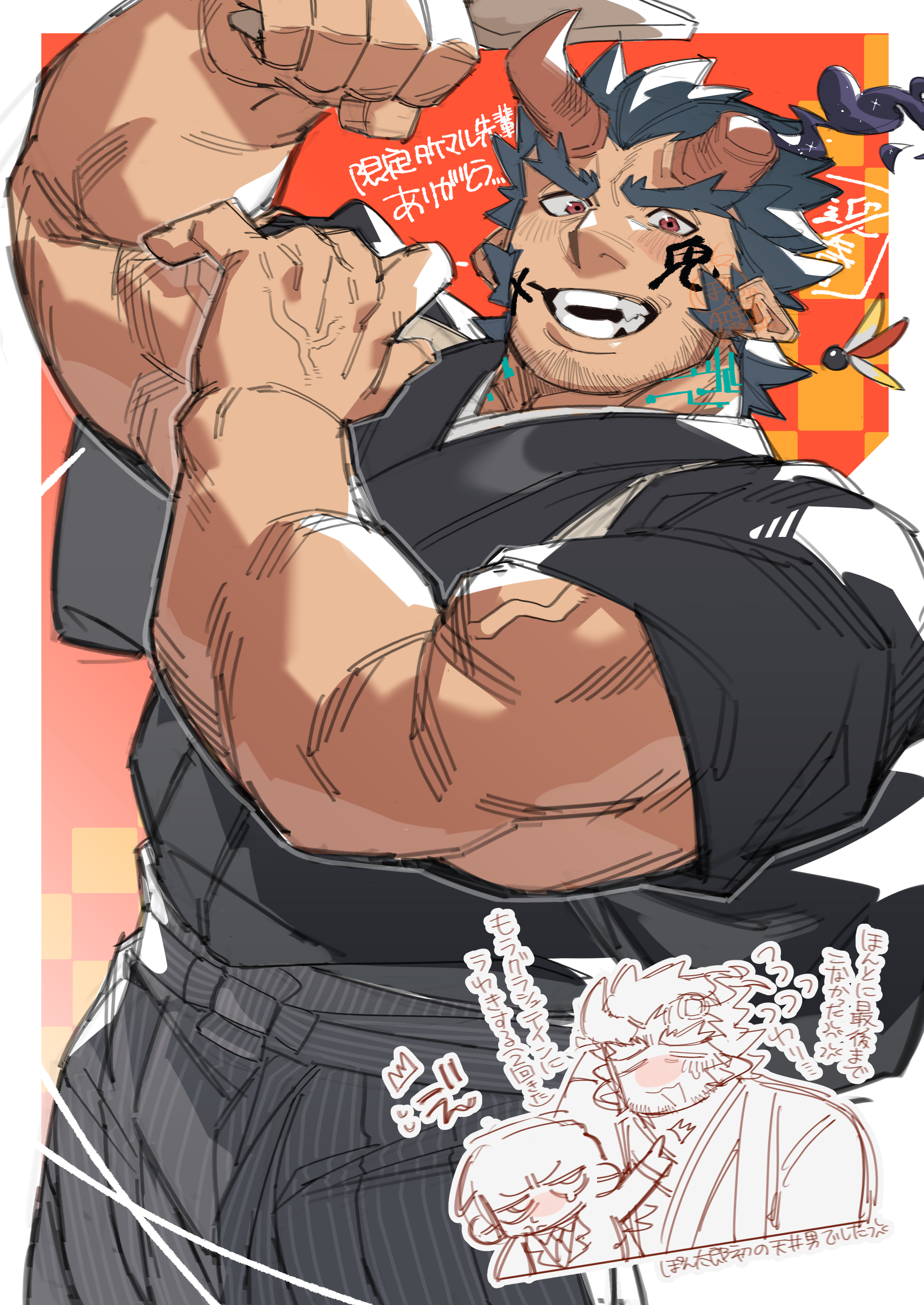 &{ID:13317634 CreatedAt:Sat Jan 17 18:31:16 -0600 2026 Score:0 Width:2508 Height:3541 MD5:fe352d1c388a522066c22bee84eceaf6 Directory:fe/35 Image:fe352d1c388a522066c22bee84eceaf6.jpg Rating:general Source:https://twitter.com/pon20021202/status/2010540090817495239 Change:1768696278 Owner:danbooru CreatorID:6498 ParentID:0 Sample:1 PreviewHeight:350 PreviewWidth:247 Tags:1boy absurdres bara black_kimono blue_hair blush broken_horn commentary_request demon_boy demon_horns facepaint facial_hair fangs fiery_horns forked_eyebrows grey_hakama hagoita hakama hane_(hanetsuki) hanetsuki highres holding holding_paddle horns japanese_clothes kimono long_sideburns looking_at_viewer male_focus mature_male muscular muscular_male new_year official_alternate_costume open_mouth paddle pontaro protagonist_2_(housamo) red_eyes short_hair sideburns sleeves_rolled_up smile solo stubble takemaru_(housamo) thick_arms thick_eyebrows tokyo_houkago_summoners translation_request v-shaped_eyebrows veins veiny_arms vertical-striped_hakama Title: HasNotes:false HasComments:false FileURL:https://img2.gelbooru.com/images/fe/35/fe352d1c388a522066c22bee84eceaf6.jpg PreviewURL:https://gelbooru.com/thumbnails/fe/35/thumbnail_fe352d1c388a522066c22bee84eceaf6.jpg SampleURL:https://img2.gelbooru.com/samples/fe/35/sample_fe352d1c388a522066c22bee84eceaf6.jpg SampleHeight:1200 SampleWidth:850 Status:active PostLocked:0 HasChildren:false IsVideo:false DisplayDate:17.01.2026 18:31}