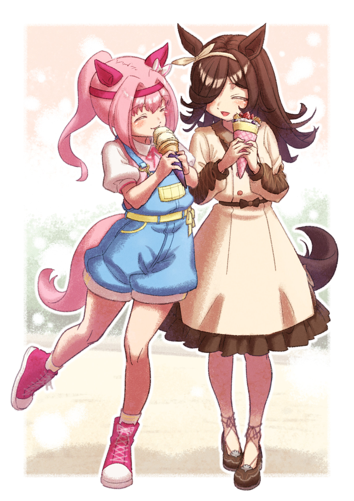 2girls animal_ears blue_overalls blush bow bow_hairband brown_dress brown_hair brown_hairband casual closed_eyes closed_mouth collared_dress commentary_request creape crepe dress ear_bow ear_covers flipped_hair food full_body hair_over_one_eye hairband haru_urara_(casual)_(umamusume) haru_urara_(umamusume) headband highres holding holding_crepe holding_food holding_ice_cream_cone horse_ears horse_girl horse_tail ice_cream_cone long_hair long_sleeves multiple_girls official_alternate_costume open_mouth overall_shorts overalls pink_hair pink_headband pink_shirt ponytail red_headband ribbon rice_shower_(casual)_(umamusume) rice_shower_(umamusume) shirt shoes short_sleeves smile socks tail umamusume white_hairband