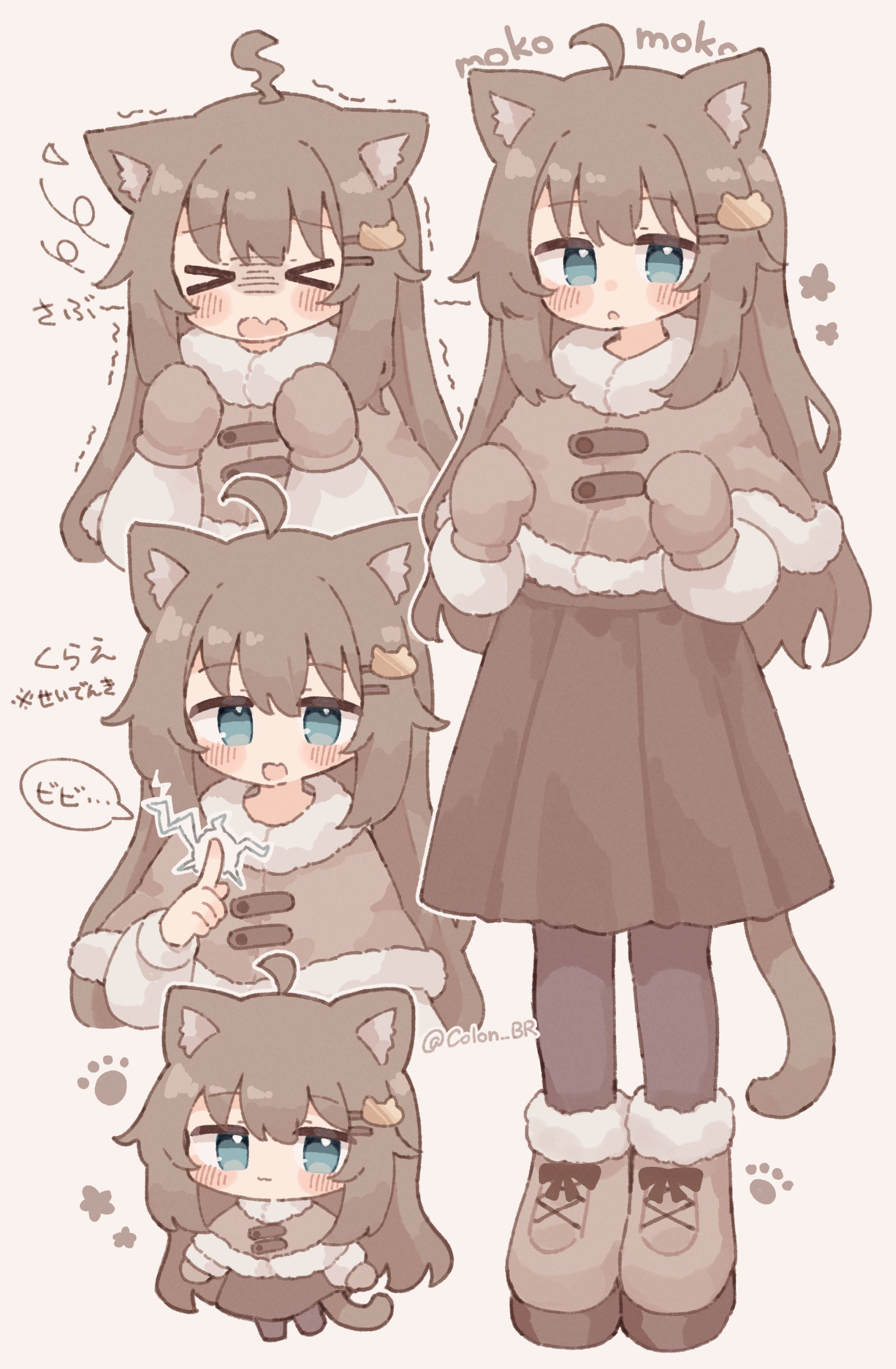 >_< 1girl :3 :d :o absurdres ahoge biachan_(colon_br) black_pantyhose blush_stickers boots brown_boots brown_hair brown_mittens brown_skirt capelet cat_hair_ornament chibi closed_eyes closed_mouth colon_br commentary_request full_body fur-trimmed_boots fur-trimmed_capelet fur_trim green_eyes grey_capelet hair_ornament hairclip highres long_hair long_sleeves looking_at_viewer mittens open_mouth original pantyhose parallel_hairclips pleated_skirt sidelocks simple_background skirt smile speech_bubble standing translation_request trembling white_background winter_clothes