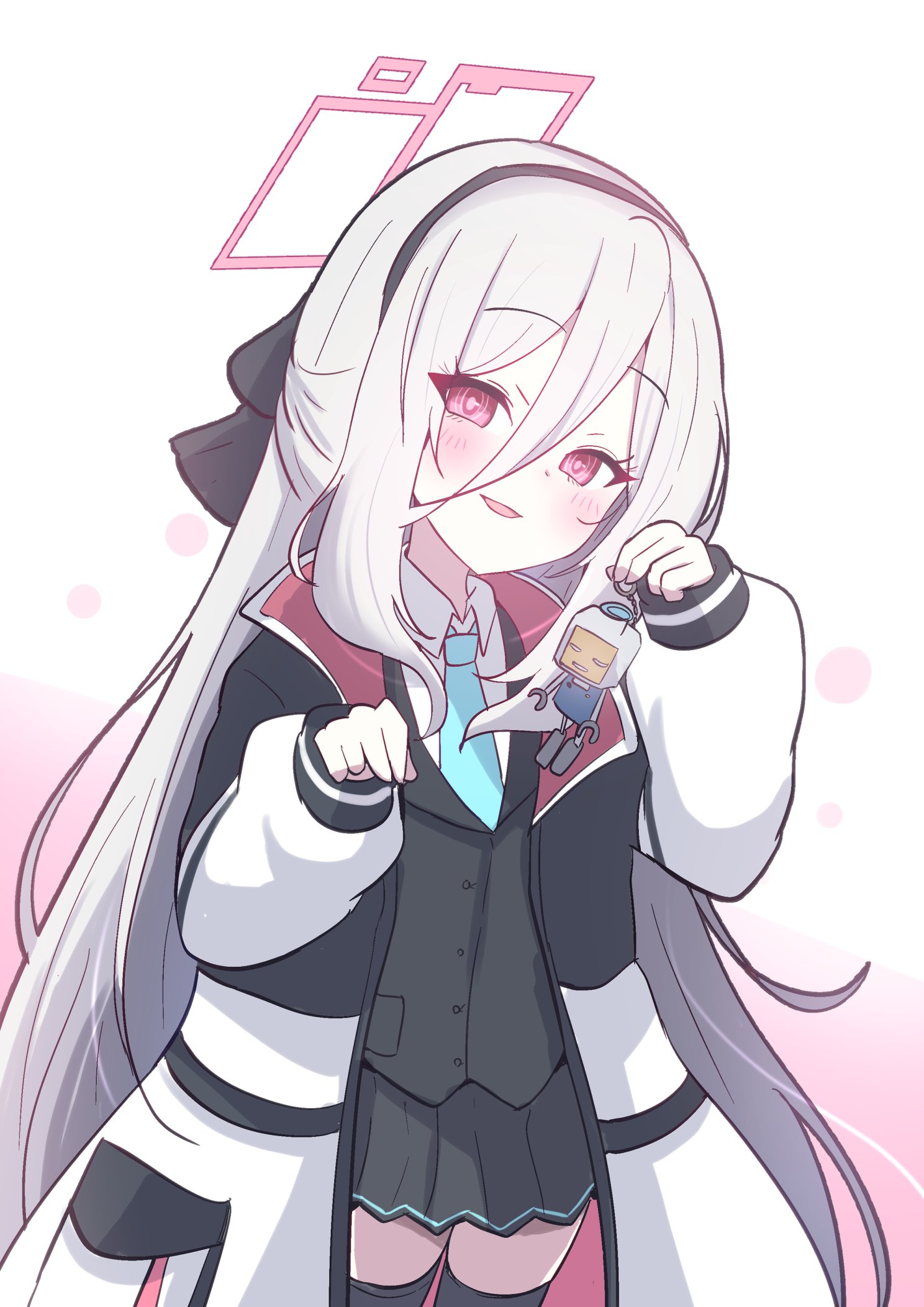 1girl black_hairband black_skirt black_vest blue_archive blue_necktie blush bow commentary_request giorgio_(yo_sumire_sola1) hair_between_eyes hair_bow hairband halo highres jacket kei_(blue_archive) kei_(new_body)_(blue_archive) kei_(robot)_(blue_archive) long_hair_between_eyes looking_at_viewer multicolored_jacket necktie rectangular_halo red_eyes red_halo ringed_eyes robot school_uniform skirt smile solo two-tone_jacket v vest white_background
