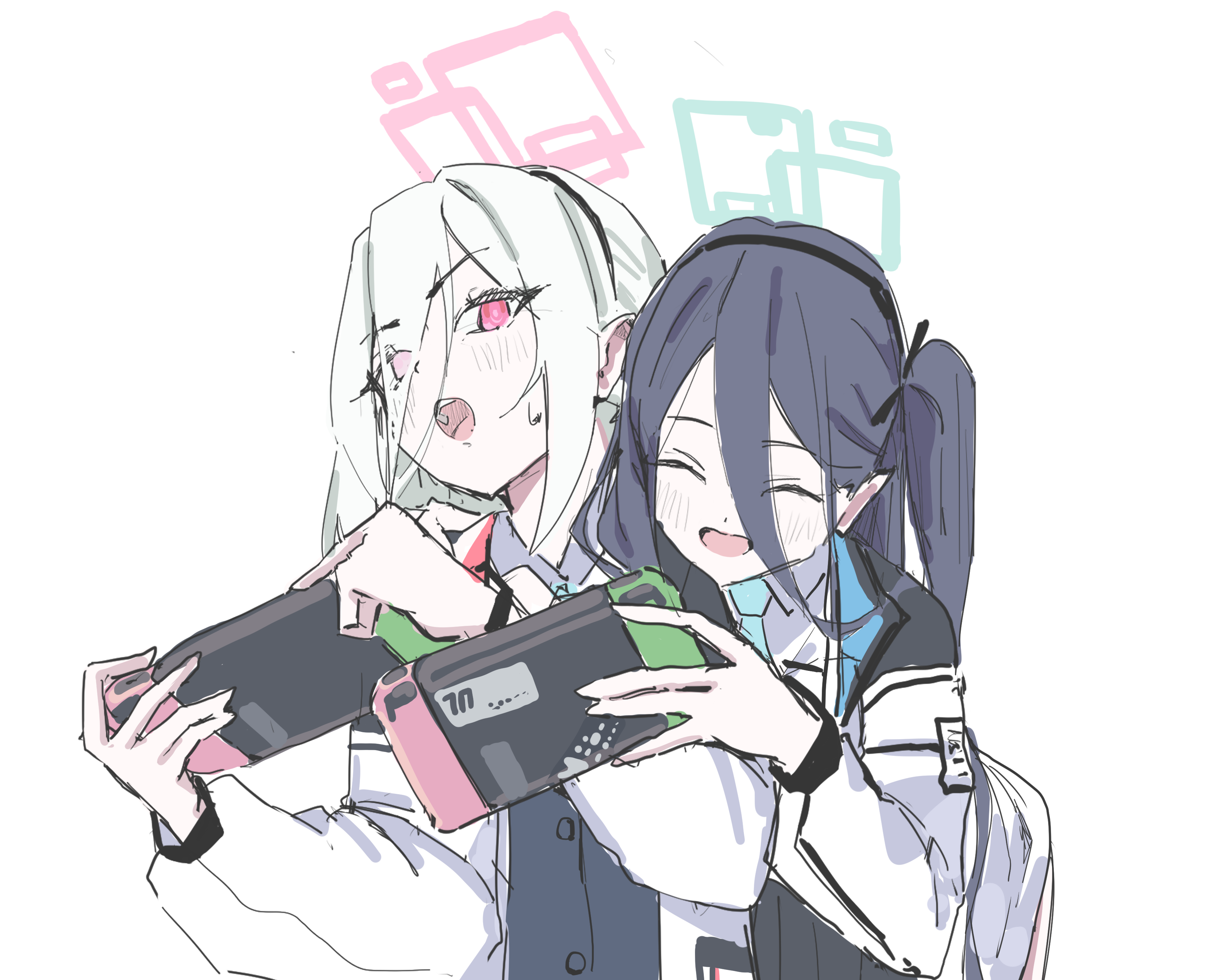2girls :o absurdres aris_(blue_archive) black_hair blue_archive blue_halo blue_necktie commentary_request hair_between_eyes halo handheld_game_console highres hokori1207 holding holding_handheld_game_console jacket kei_(blue_archive) kei_(new_body)_(blue_archive) korean_commentary long_hair long_sleeves multiple_girls necktie one_side_up open_mouth pink_eyes pink_halo simple_background smile sweatdrop white_background white_hair