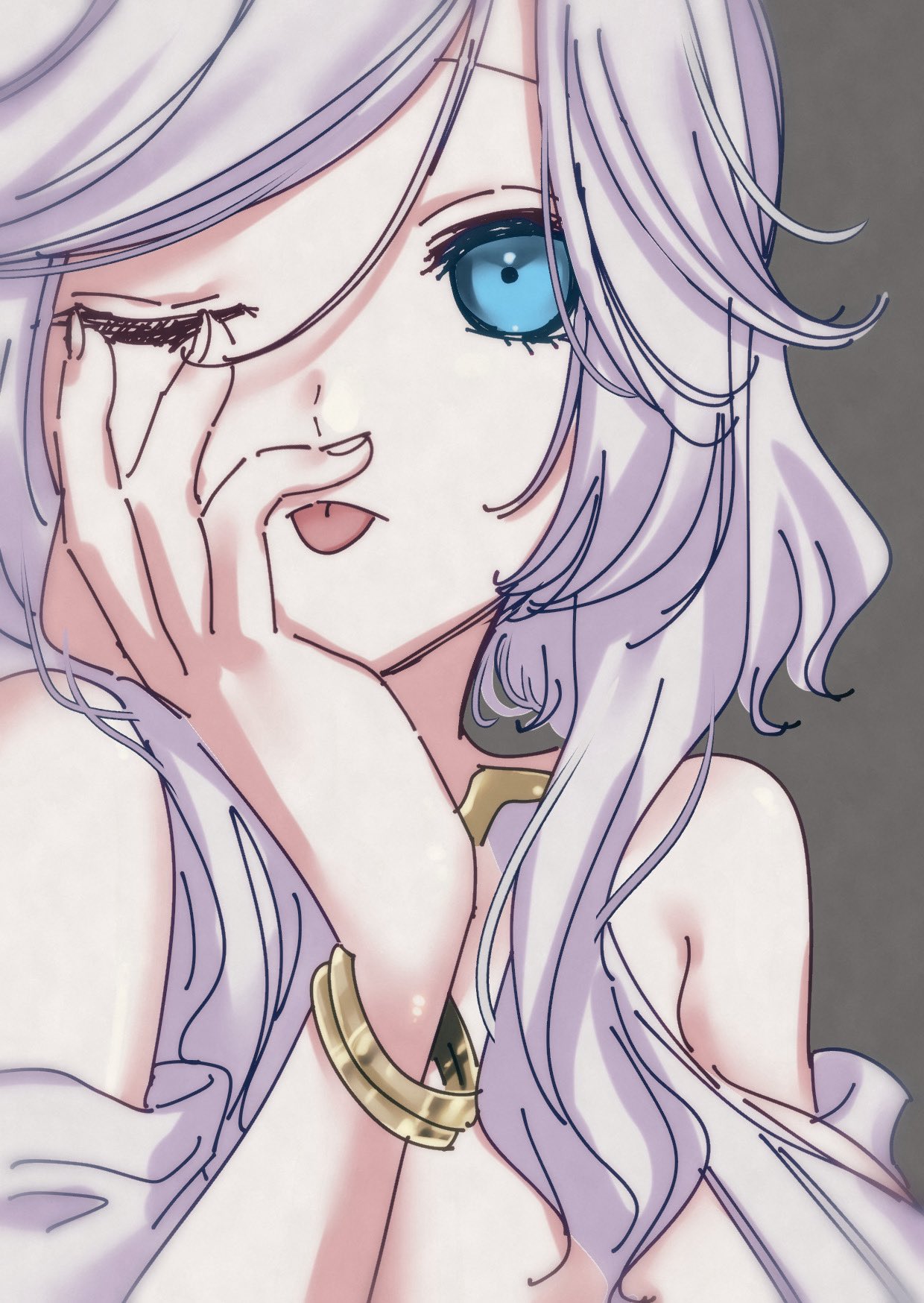 1girl animal_ears bare_shoulders blue_eyes breasts cat_ears commentary_request highres long_hair looking_at_viewer lunacia_(nyanko_daisensou) nako_(milkyway-miffy) nyanko_daisensou solo white_hair