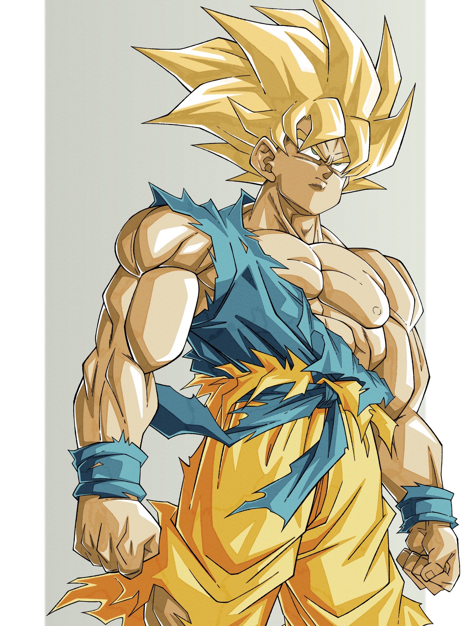 1boy artjohnny1020 blonde_hair blue_shirt border commentary_request cowboy_shot dragon_ball dragonball_z green_eyes grey_background highres male_focus medium_hair muscular muscular_male orange_pants pants shirt simple_background solo son_goku spiked_hair super_saiyan super_saiyan_1 torn_clothes torn_pants torn_shirt white_border