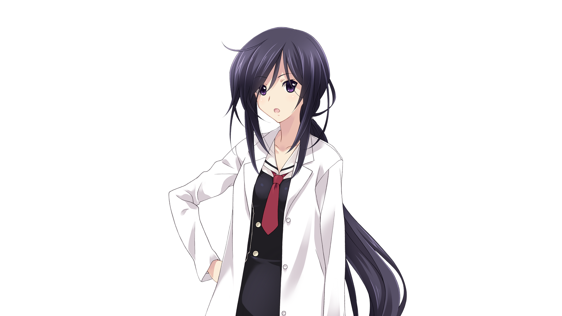 1girl black_dress breasts chaos;child collarbone dress game_cg hand_on_own_hip hekiho_academy_school_uniform highres kunosato_mio lab_coat long_hair long_sidelocks looking_at_viewer matsuo_yukihiro medium_breasts necktie non-web_source official_art open_mouth ponytail purple_eyes purple_hair red_necktie sailor_collar school_uniform science_adventure short_necktie sidelocks solo sprite transparent_background very_long_hair white_sailor_collar