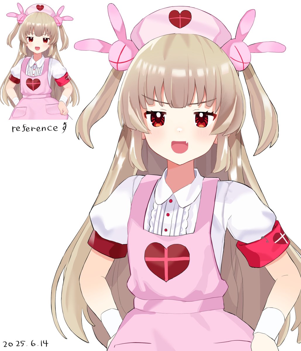1girl apron armband bandaged_wrist bandages blonde_hair blush commentary_request dated derivative_work fang hair_ornament hat heart heart_print highres long_hair looking_at_viewer natori_sana natori_sana_(nurse) nurse_cap official_art_inset okaki8130 open_mouth pink_apron pink_hat rabbit_hair_ornament red_armband red_eyes reference_inset sana_channel shirt short_sleeves skin_fang solo two_side_up virtual_youtuber white_background white_shirt
