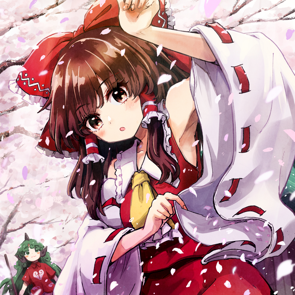 2girls :3 ascot bow brown_eyes brown_hair cherry_blossoms closed_mouth commentary_request curly_hair detached_sleeves falling_petals frilled_bow frilled_hair_tubes frills green_eyes green_hair hair_bow hair_tubes hakurei_reimu horns kariyushi_shirt komainu_ears komainu_girl komano_aunn long_hair looking_at_viewer mizumoto_tadashi multiple_girls open_mouth petals pink_petals red_bow red_shirt red_skirt ribbon-trimmed_sleeves ribbon_trim shirt single_horn skirt skirt_set touhou yellow_ascot
