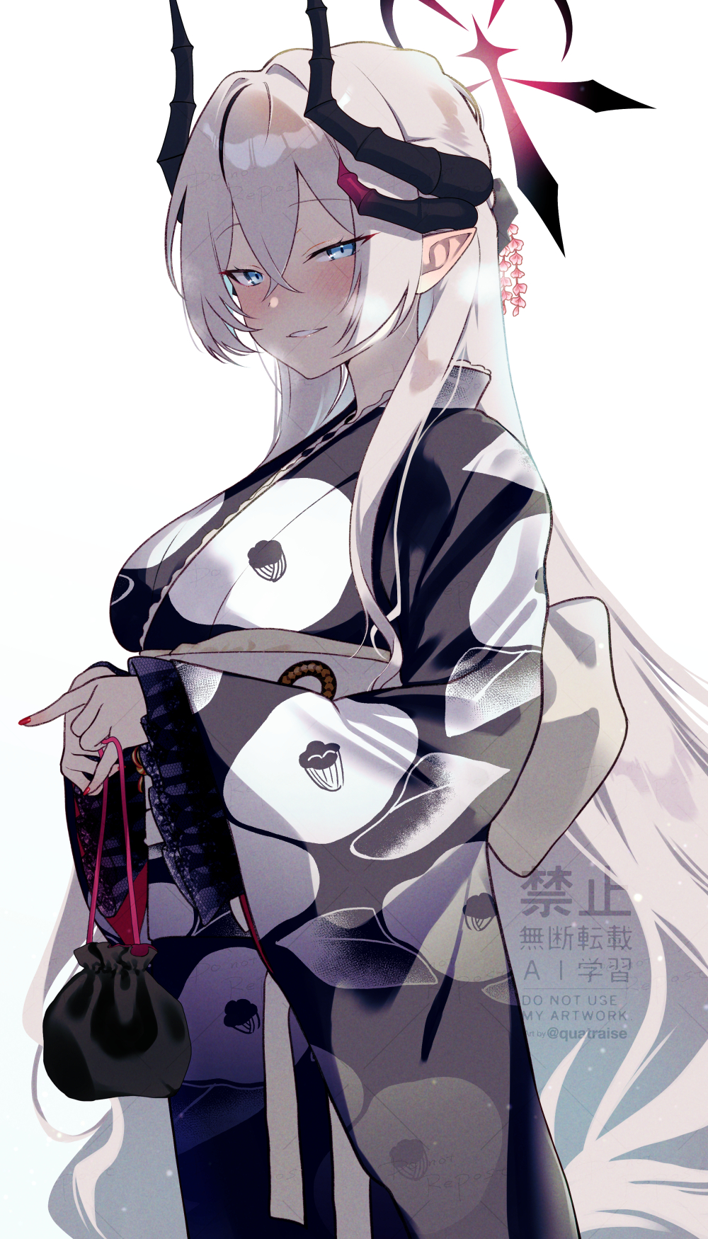 1girl alternate_costume black_kimono blue_archive blush breasts commentary_request crossed_bangs demon_horns grey_hair halo highres horns japanese_clothes kimono large_breasts long_hair long_sleeves looking_at_viewer makoto_(blue_archive) obi pointy_ears quatraise sash simple_background smile solo straight_hair very_long_hair watermark white_background